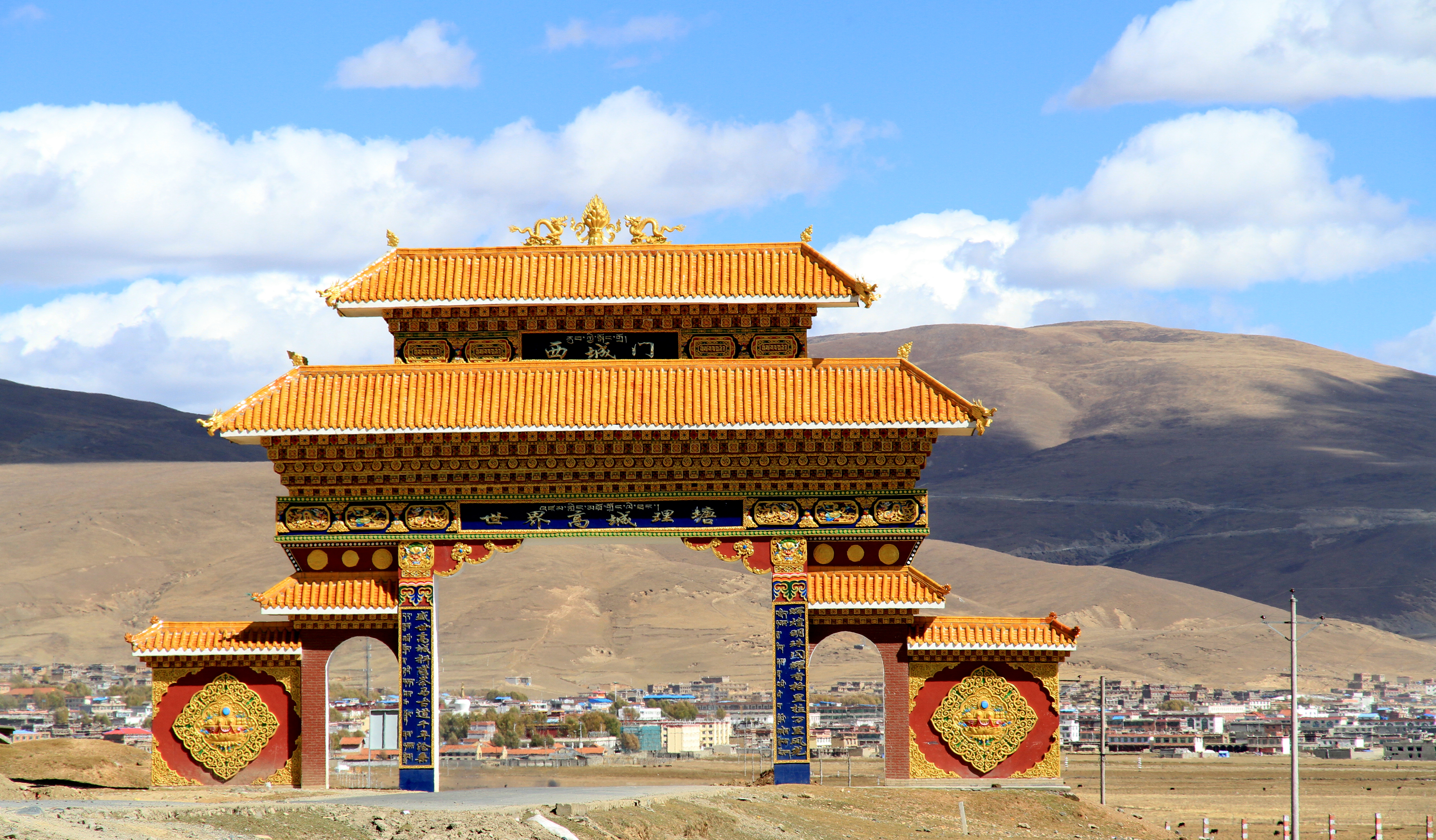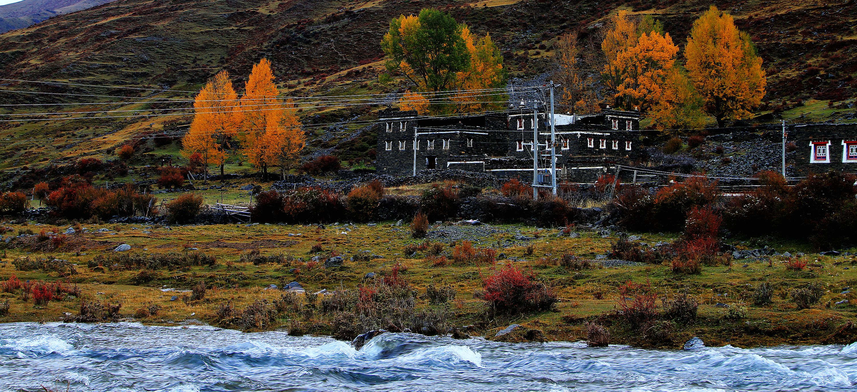 新都桥的藏式民居极有特点,有很宽敞的白墙院子和朱漆大门, 房屋大都采用石料建造,朝阳而居,采光极好,每座楼房的每面墙上开着三四扇窗户,窗檐上用红、黑、白等色彩描绘着,象征人丁兴旺、五谷丰登之意的日月或者三角形图案。 驱车游玩于新都桥路段,让人感到了“香格里拉”的帷幕正渐次拉开。那里生命与自然、人与环境、和平与宁静的鲜花正和谐绽放。天空色彩幻变无穷,让人忘掉了旅途的辛苦,我们不时地咔嚓、收藏几张美丽的秋景。