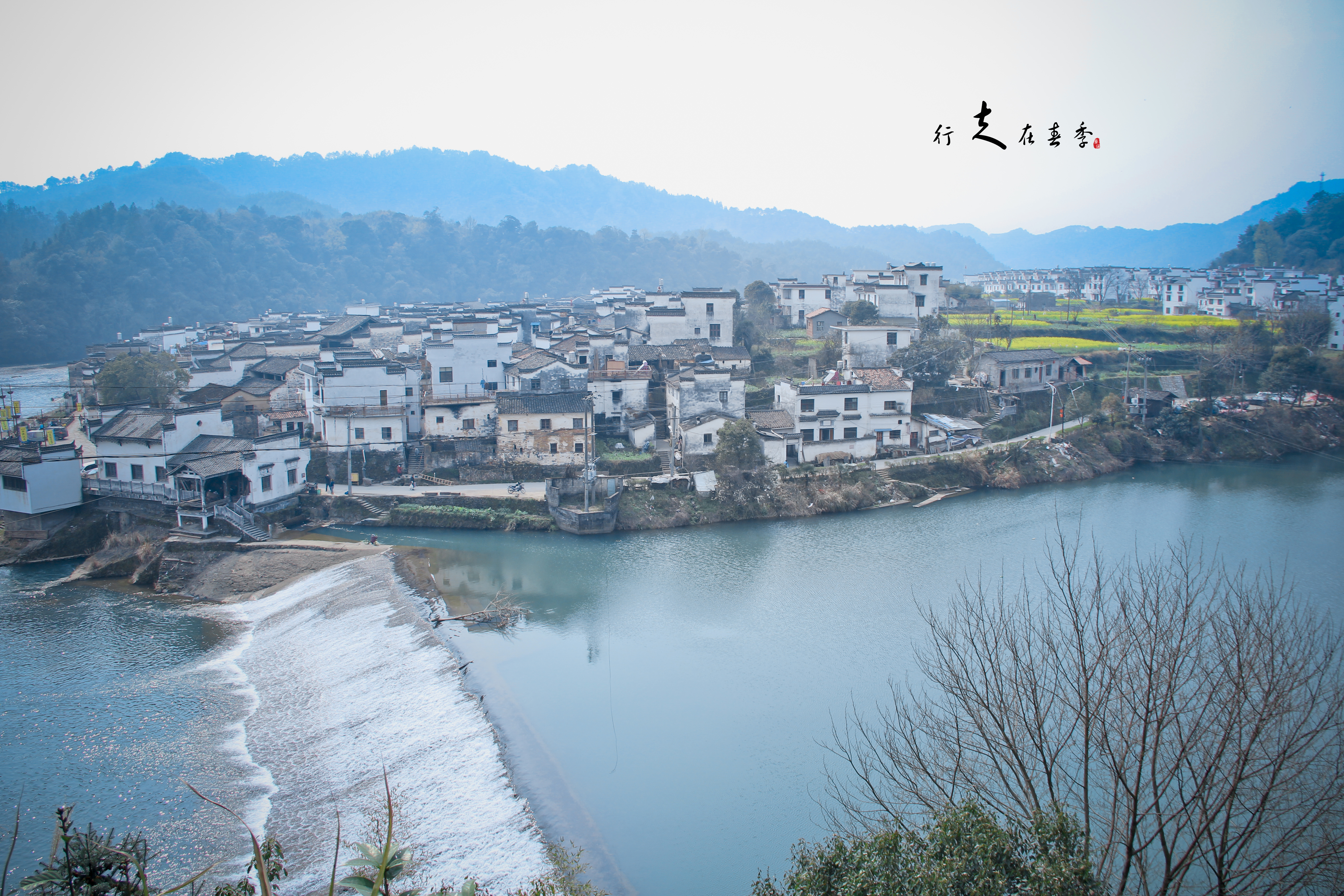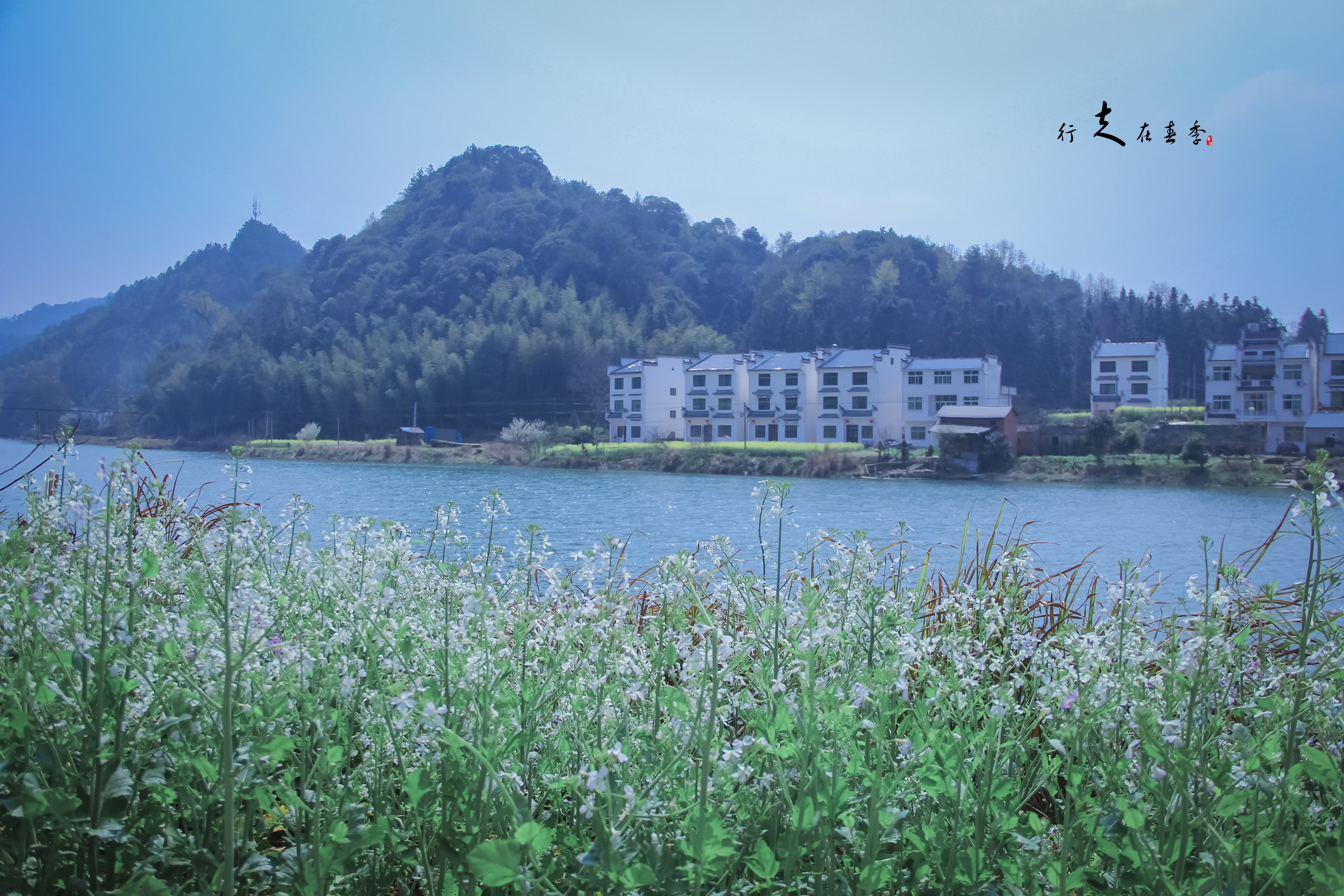在每一片花海前尽情拍照,拍完后继续前行,村中满眼尽是徽派建筑,黑瓦白墙在蓝天的衬托下显得格外好看。一条小河沿着村子流过,河 边是排商铺,卖着当地的特色食品与特产,我们没有过多停留,一路前行出村。