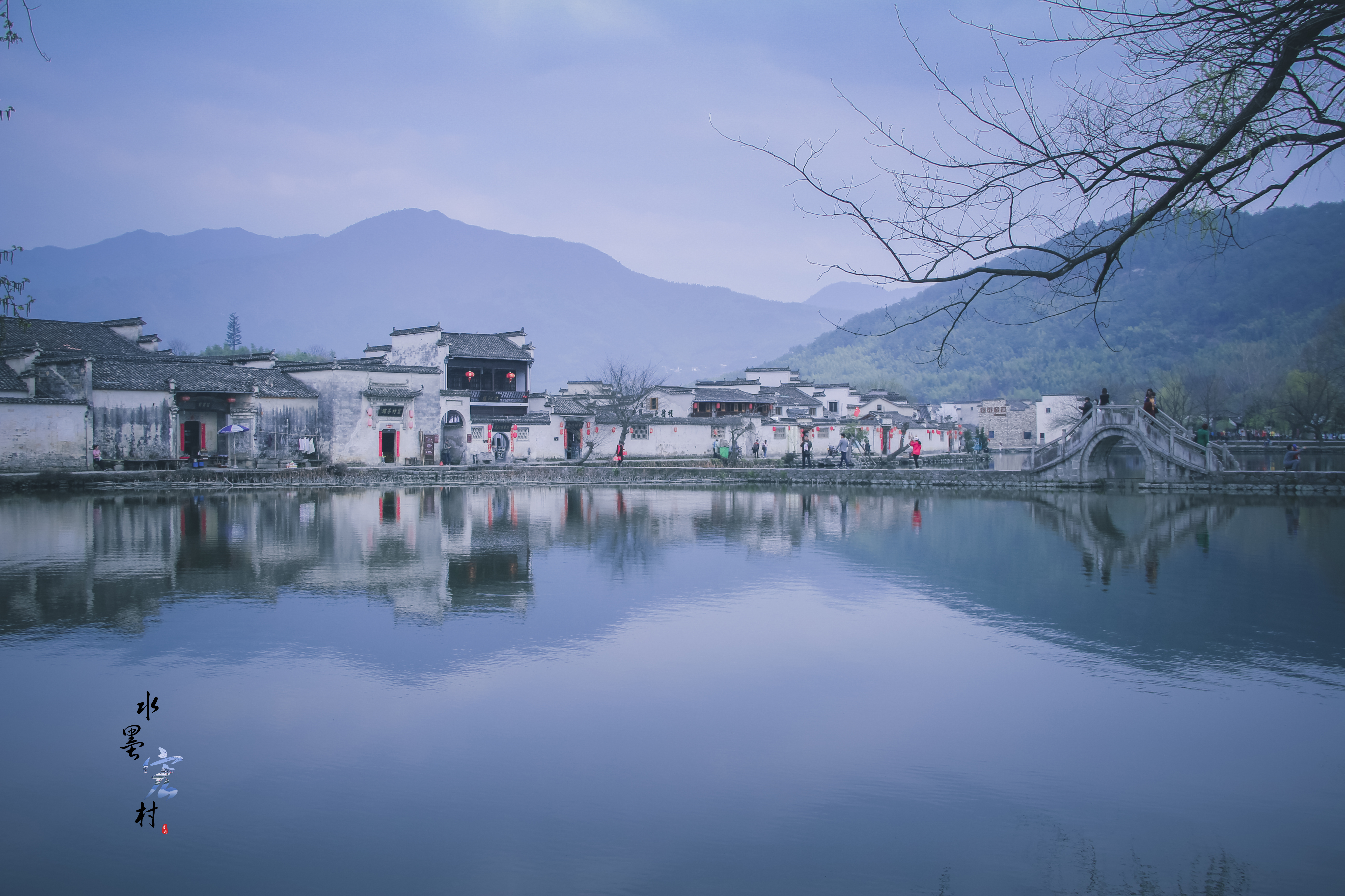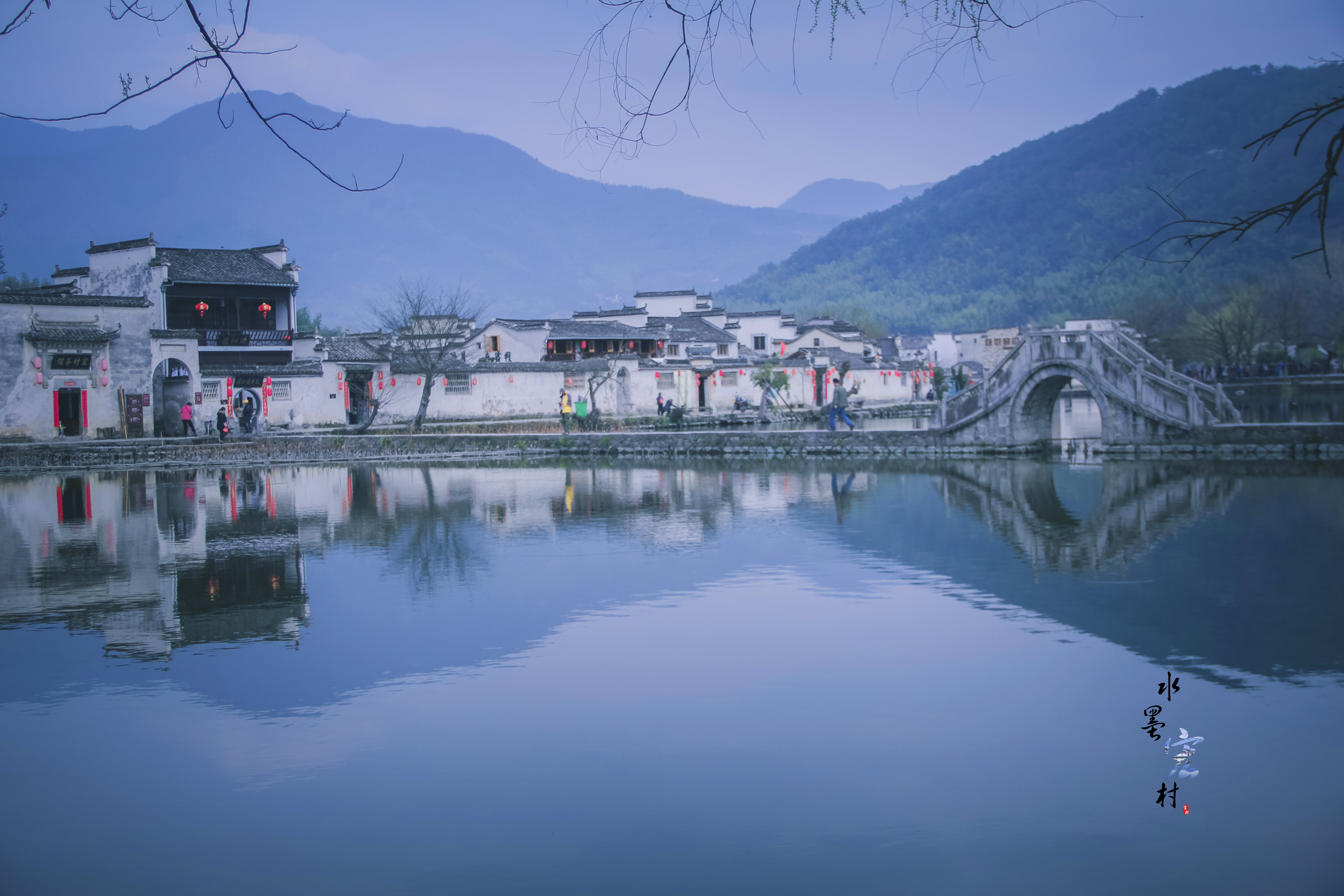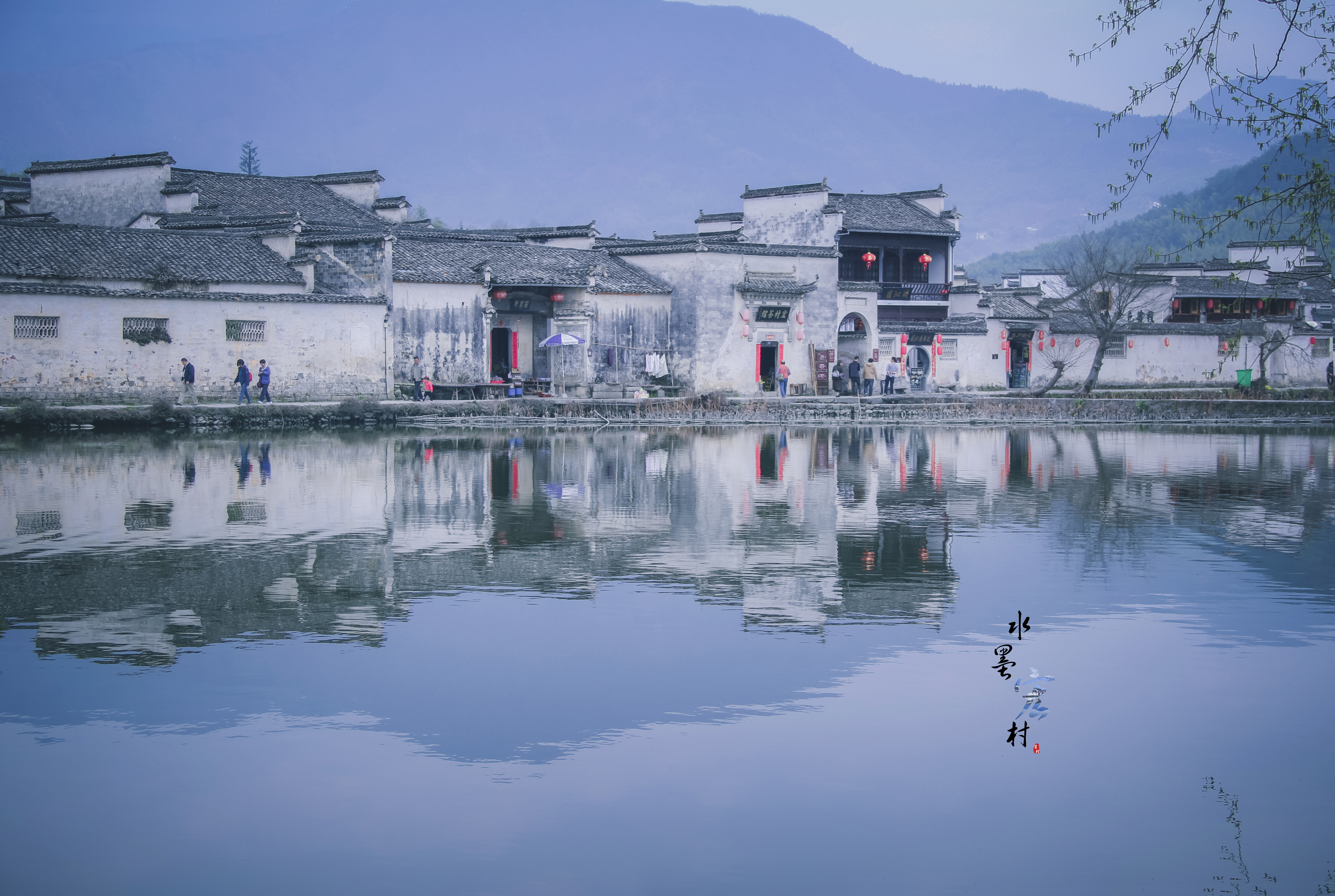 几笔浓重的蓝色,再涂上白色,点缀几笔红与黑,便成这水墨宏村。