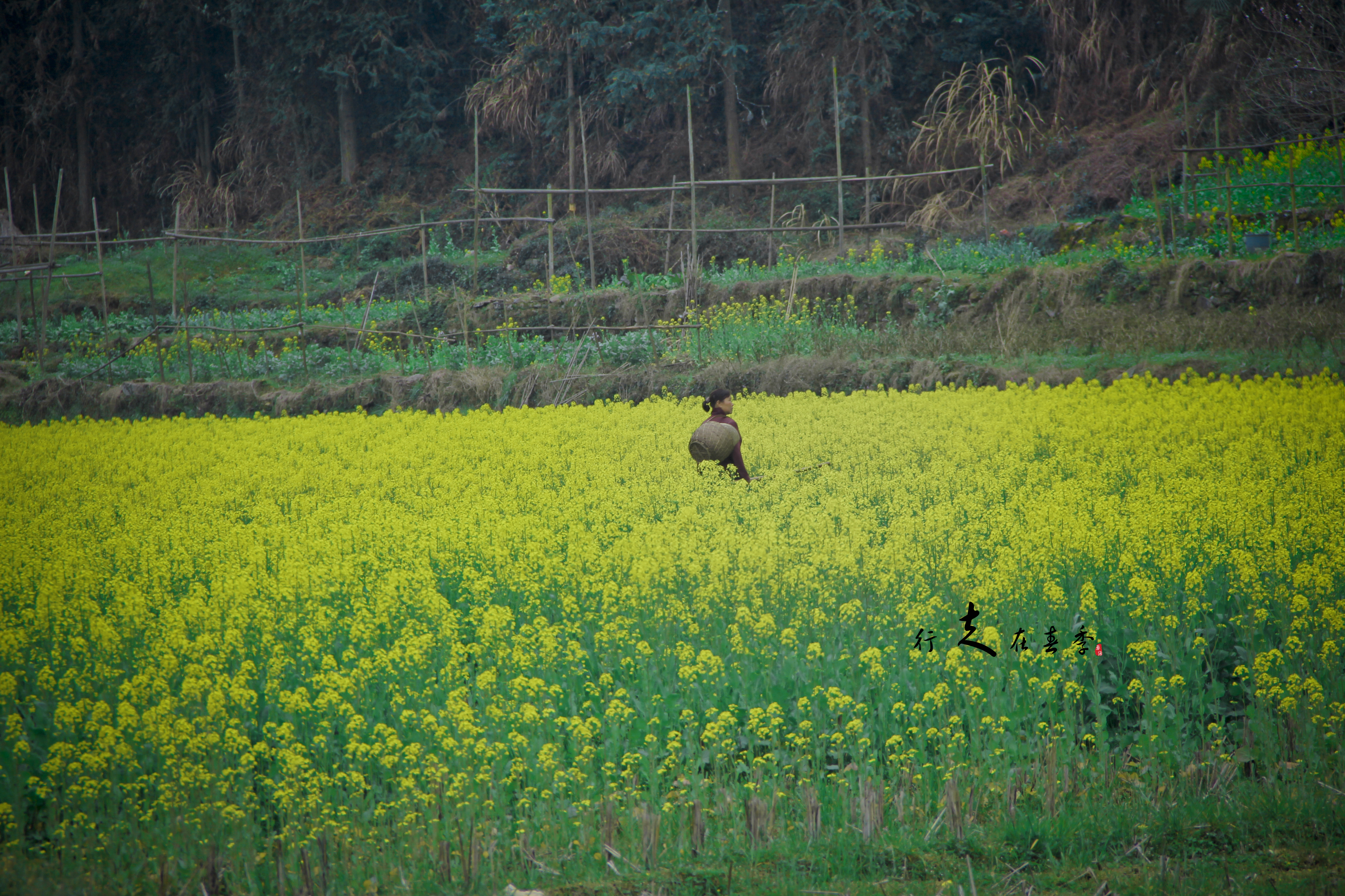 沿着木桥过河,是一片油菜花地。田间还有正在农作的妇人。