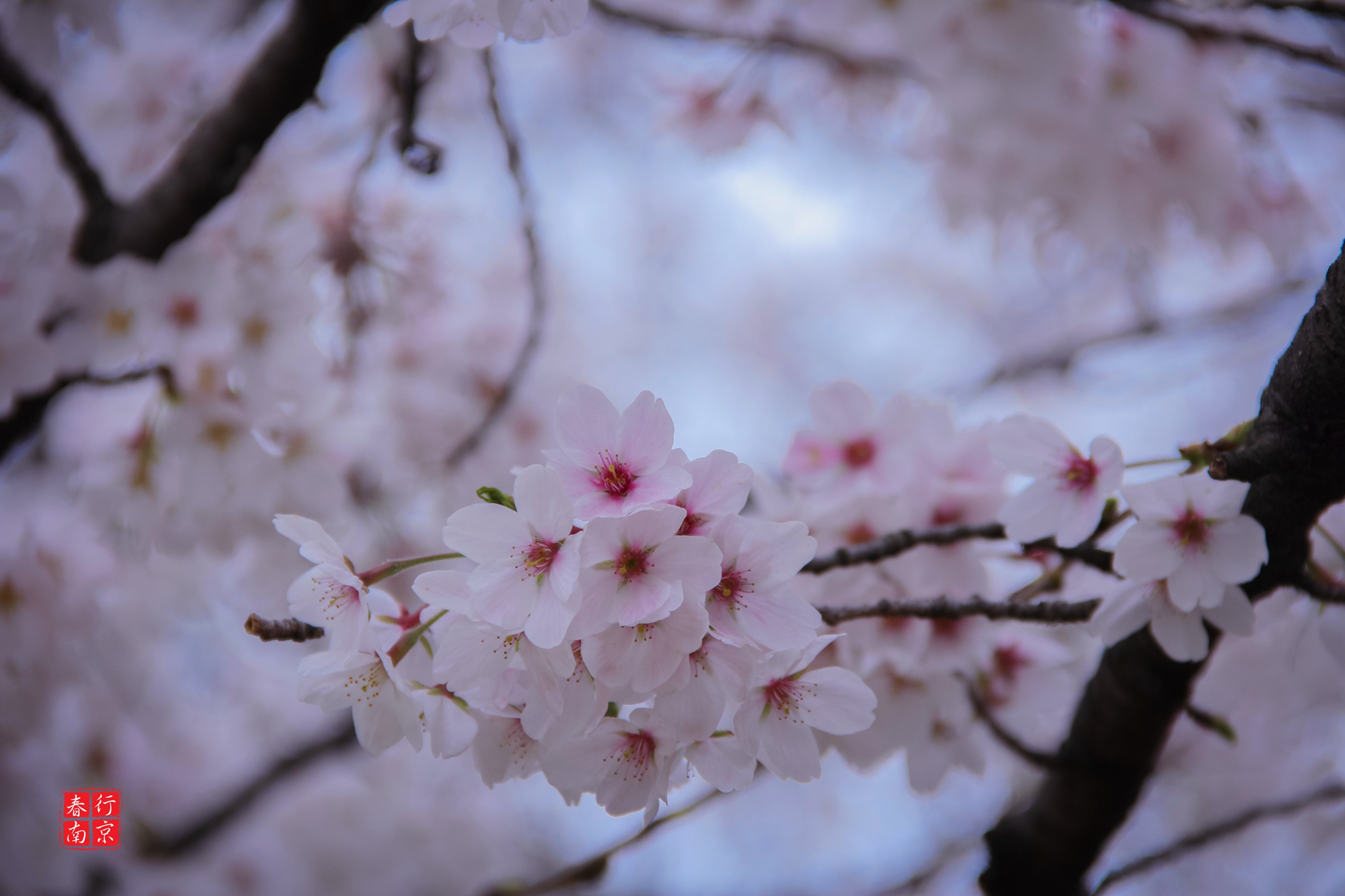 鸡鸣寺到和平门的樱花道上早已警戒起来,虽是早晨,却已聚集了许多看花的人,马路上、人行道上全是赏樱的人,那场景和正月十五赏灯会的人一样多。由此也足以可见爱花人之多。