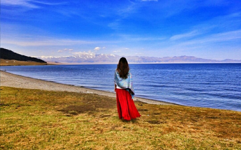 对面山峰的巍峨,跟我们团走的一位大美女~真的很上镜,背影更显神秘!这湖在新疆如同圣地!