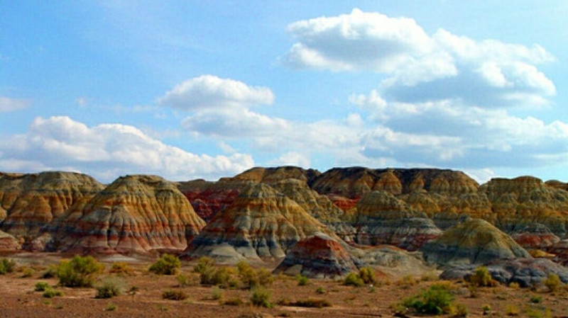 五彩湾:五彩湾并不仅仅是一个地方,它被人们泛指在东准葛尔一片彩色斑斓的风蚀地~有著名的五彩城,火烧山,白天红的,黄的,白色的土地滩,山头,傍晚的落霞加上艳红的石头土地,构成美丽的花卷,我让司机小肖给我们照了很多美丽的艺术照