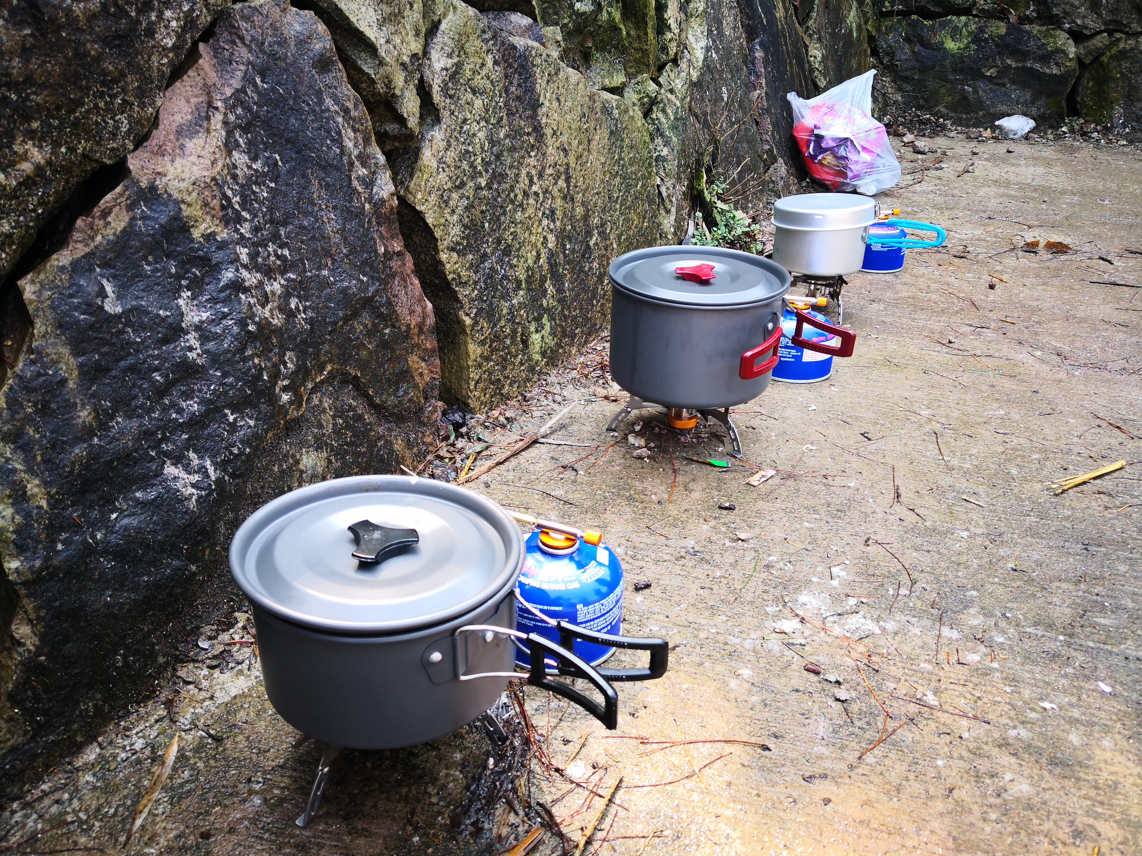 终于终于到达了第二个水库,榴莲和他的小助手们已经到达现场给我们烧起了水,我也见到了本次最令我期待的东西——炉头套锅,感谢榴莲给我们讲解如何使用,有榴莲在,就稳稳的,在户外,能吃上个热食,真的是世界上最幸福的事情了,