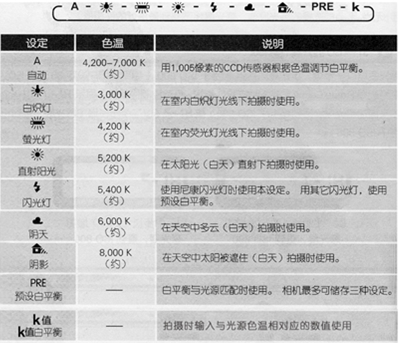 分档设定白平衡,是按光源种类分和色温值分两类。现在大多数数码相机都是按光源种类分的这类。在相机上分别设有日光、阴天、日光灯、白炽灯、闪光灯的图标档位。拍摄时只需将拍摄时的光源种类和相机上的白平衡档位相吻合就可拍出较为准确的色彩。但由于分设档位少,分设档位的精度不高,在一些特殊光照条件下拍摄就不能准确的记录色彩。按色温分类的白平衡,理论上讲其精度要高于按光源种类分档。但它要求使用者要记住各种光源的色温值,这就给使用者带来极大的麻烦。故用此分档白平衡的相机较少。