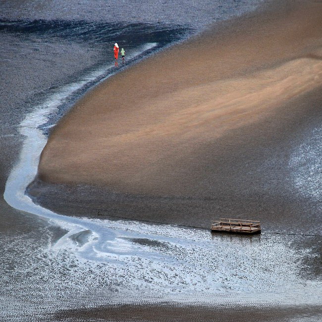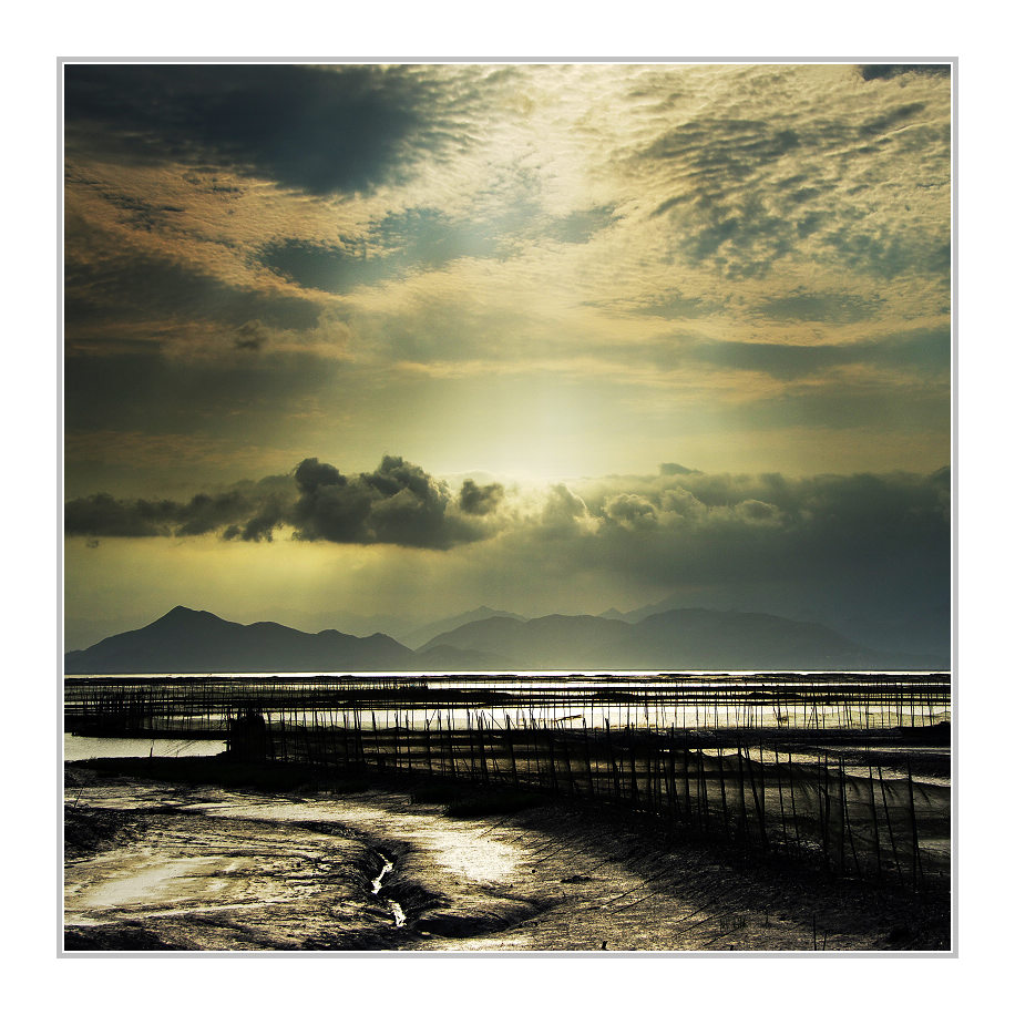 滩涂是海的一个部分,涨潮时它和大海浑然一体,有着水天一色的辽阔,有着惊涛拍岸的壮美;退潮时它裸露出经年的风霜。那弯弯曲曲的港湾,星星点点的渔舟,绵延无际的挂蛎,海风中漂摇的紫菜,碧波上荡漾的渔排,还有金色沙滩上晾晒着碧绿的渔网,等等,所有这些,随着潮水的涨退,变幻着无穷的组合,吸引着无数摄影人的目光。