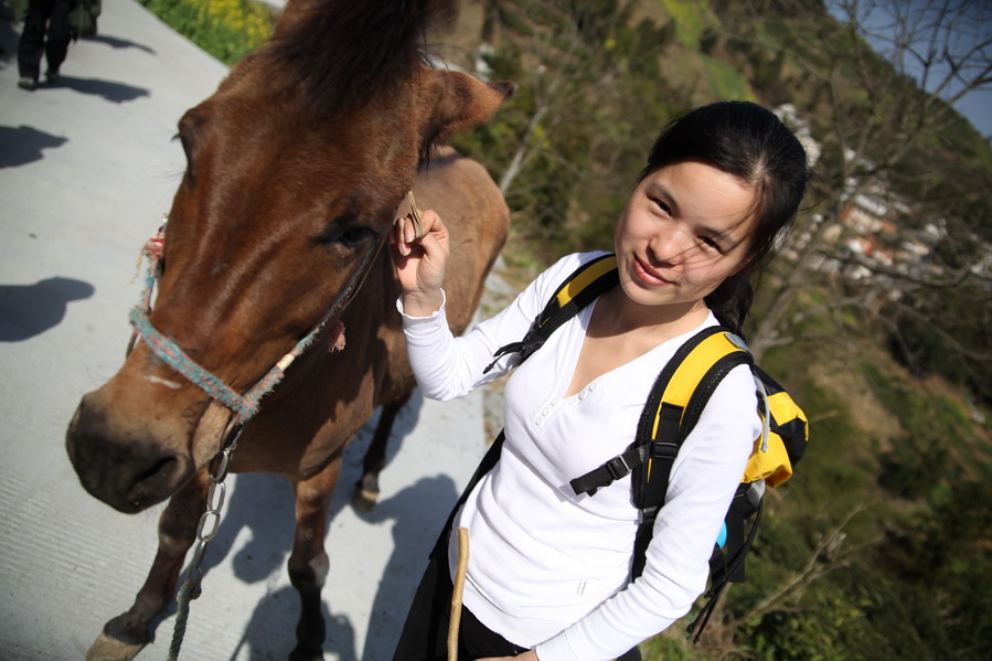 到了山顶了,碰到了一头很像马的动物,好像牵回去给我家笨咪连手艺