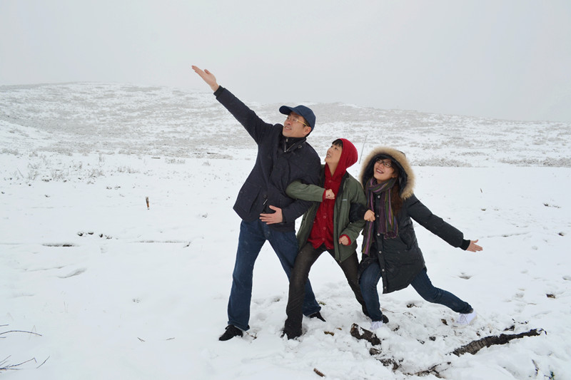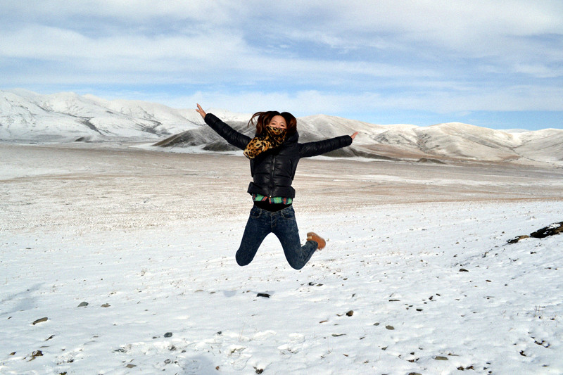 一路开着开着,视线慢慢开阔起来了,随着海拔慢慢上升,天气也随时在变,快到垭口的时候,眼前开始白茫茫了起来,随着欢迎我们的就是一大片一大片大片滴。。。雪地。司机师傅人超好,难挡我们的活跃气氛啊,给我们停了车,哈哈哈哈。。。