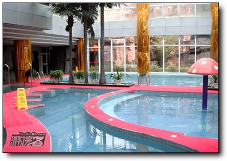 来到酒店大堂,一个大大的“醉”字矗立门前。大堂富丽堂皇,是准五星级的酒店哦。左手边为入口楼梯,在前台换了手牌后,就从这里刷牌进入,楼梯下则为泳衣售卖部。右手边为出口楼梯和结账台,客人消费结账后,将手牌换成一张卡,刷卡出门即可。
