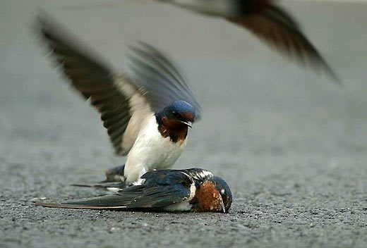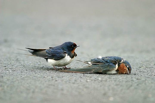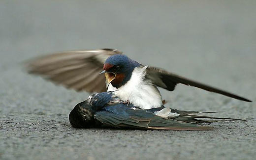 鸟儿的感情也是相当丰富的。尽管这只家燕已经在地上不会动了,但是,另一只仿佛是她的家人,马上飞到她的身旁,不忍相信这个实事... ...