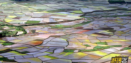 昭平县仙回瑶族乡上千亩刚插完秧的稻田在阳光的映射下,色彩缤纷,宛如一幅天然水彩画。