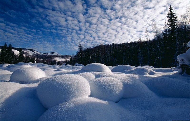 禾木村的禾木草原和禾木雪峰尤为迷人。禾木草原位于喀纳斯河与禾木河的交汇地带,海拔多在1100米和2300米之间,地形复杂,山地阴坡森林茂密,而阳坡绿草满地,繁花似锦。在夏天是个花的海洋,秋天就是漫漫的金色草海。风从高出掠过,在不同的地方凑出和弦,轻柔而悠远。牧人们的毡房隐没在草丛中。天空的蓝洁净柔和,像安静时的海面。险峻的冰山在阳光里闪耀着神奇的光辉。草原边木雪峰上,生长着大片的原始西伯利亚泰加林,让人恍然置身于阿尔匹斯山的风光中。