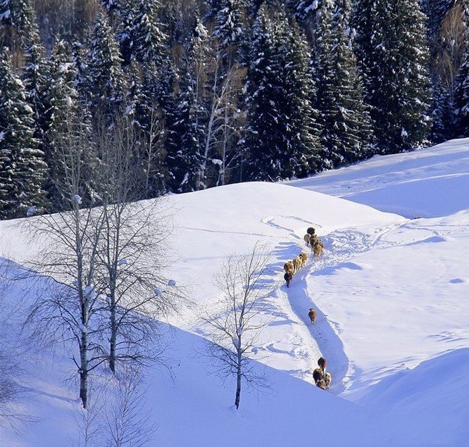 禾是阿勒泰山脉最美丽最神奇的雪峰之一,植被垂直分布明显,森林茂密,人迹罕见,只有在特定的时间可以看见阳光穿透枝叶,在草地落下斑斑点点的的光,处处有鸟儿的鸣唱,感觉身边随时会有什么出现,到处充满了原始而陌生的气息。 禾木村有一座著名的桥,是因为桥上有门,大门一关,桥的两岸就成了各自独立的世界。听村里的图瓦人说,晚上关门牲口就不会跑到对岸去。这里居住着100来户人家,图瓦人和哈萨克族人各占大约一半,很多人家里都有接待的能力,个别的也开起小旅馆和小餐厅,有的还可以洗澡。住宿和饭钱协商好,就可以放心的体验与城市不同的生活了。草原景点也可以租马,代替脚力。