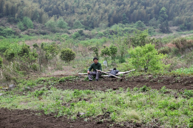 田埂上,一位老爷爷坐着休息,可能是劳作累了