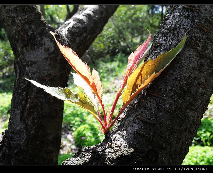 一片樱花的叶子静静的依在绿叶丛中~~~