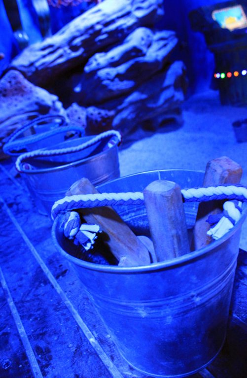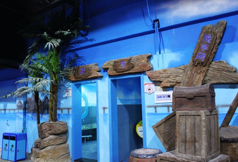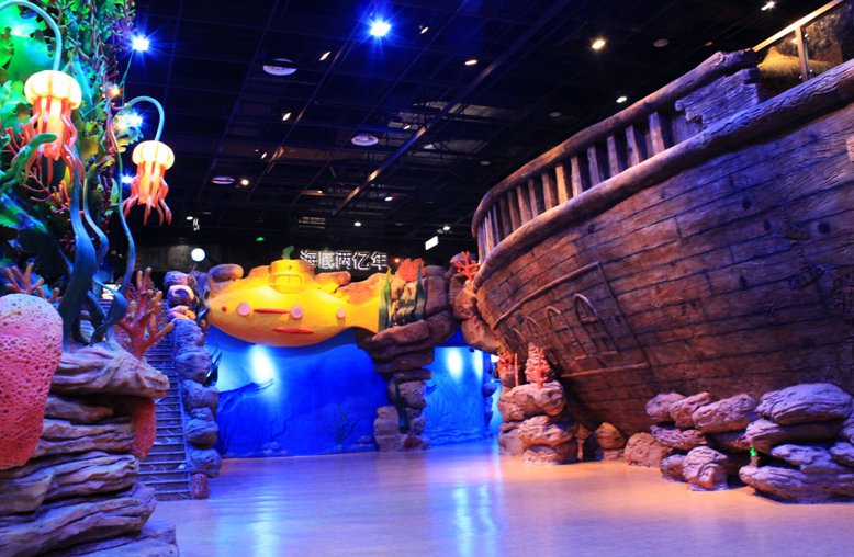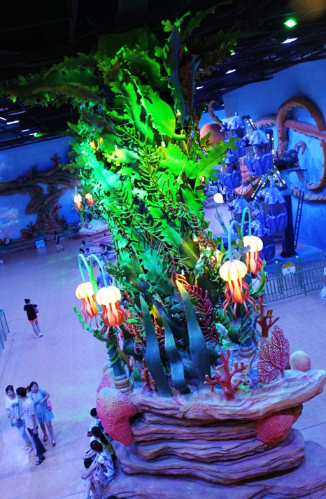 整个烂苹果乐园共有三层楼。地下一楼,五彩糖果小镇涂上了斑斓的色彩;地上一楼,一面巨大的透明水母墙已经注好了水,里面真实水母在里面舞蹈;二楼,一只巨大的黄金海盗船,这里有着海底2亿年。