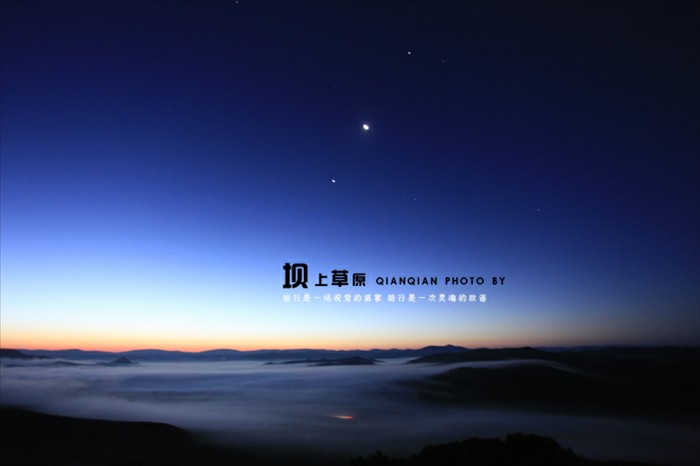 这是我收获最大的一天,黎明的云雾,星星和月亮还在,我们3点35起床的,走到酒店门口,居然漆黑一片,一个人也没有,儿子抬头看了下天空,“哇”长长的发出一声赞叹,他基本属于那种波澜不惊的物种,看着他惊奇仰望我知道是被震撼了,我也被震撼了,太久没有看到这样的夜空了,满天的繁星,秘密的点缀着草原的夜空,没一会儿领队的车子就来了,我们在乌七抹黑的路上开了没多少路,就在山脚下了,长期没有锻炼啊,气喘的和什么一样,脚下的路还看不清楚,但是冷的直哆嗦,索性有先见之明带了两条厚厚的大方巾起了作用,手感觉立马冰凉,听说只有1度的气温,领队都穿着军大衣,脸也包没了,还在那哆嗦,特别是小诺,叫我们情何以堪啊,还看见有人把被子都驼到身上裹起来了。拍照,很黑,我没有把握手持是否可以拍下来,看着边上大炮加脚架的人,我心理只有佩服他们的敬业精神,我临时借用了一下儿子的脑袋,看看下面这张,居然能拍下来啊,四点多的时候,星星月亮深蓝的天。