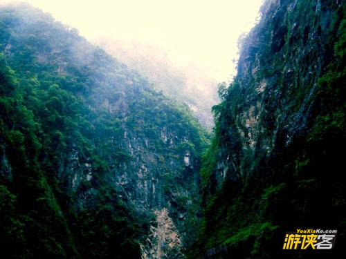 位于台湾东部花莲县西北的太鲁阁大峡谷是台湾又一个著名的旅游胜地。它是由湍流不息的溪水经过千万年的切割而形成的。峡谷中的溪水从海拔3000多米的合欢山急流而下,到入海口只有100公里左右,许多地方每公里落差达20米到30米。水流的不断切割使峡谷越来越深,于是形成了太鲁阁大峡谷这一世界奇观。要在这个峡谷中修路难度极大,人们只能在悬崖绝壁上凿石槽、打隧道、架桥梁。穿过太鲁阁大峡谷的台湾东西横贯公路全长300公里.其中1.9公里的九曲洞是太鲁阁大峡谷最主要的景点。