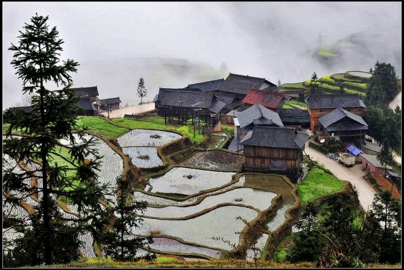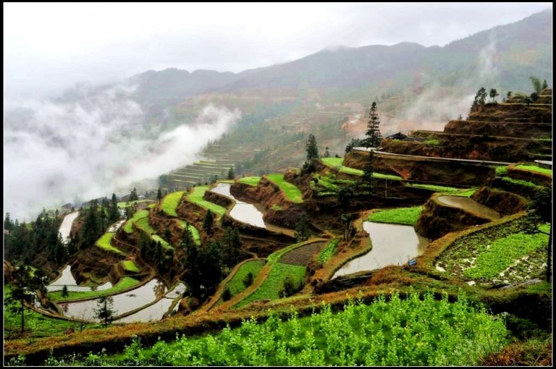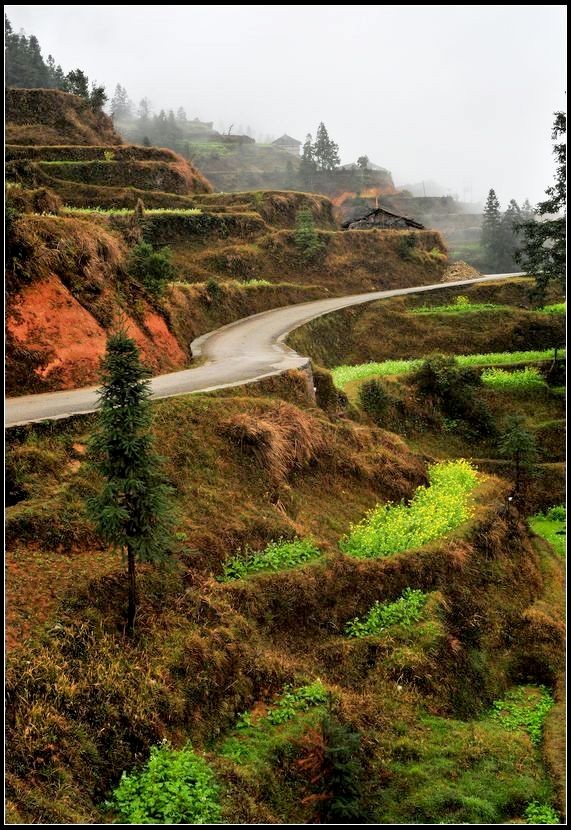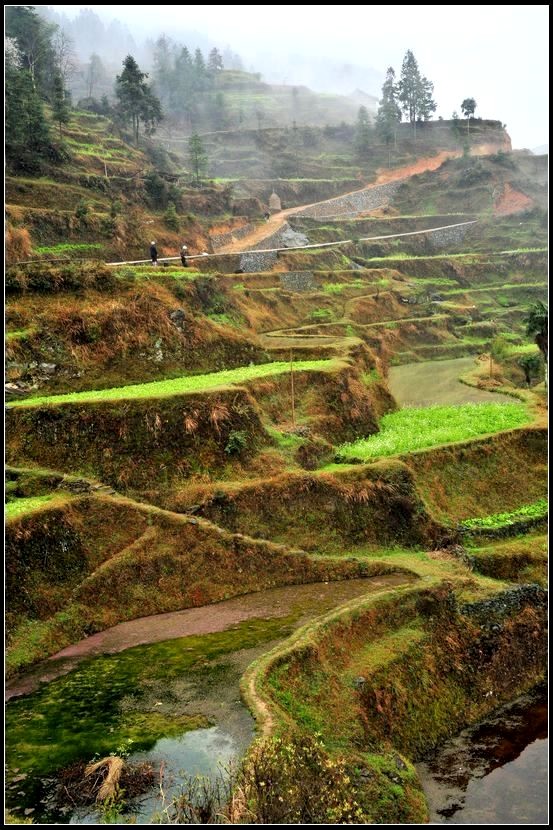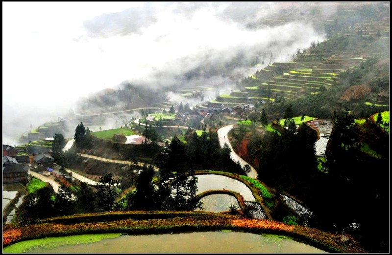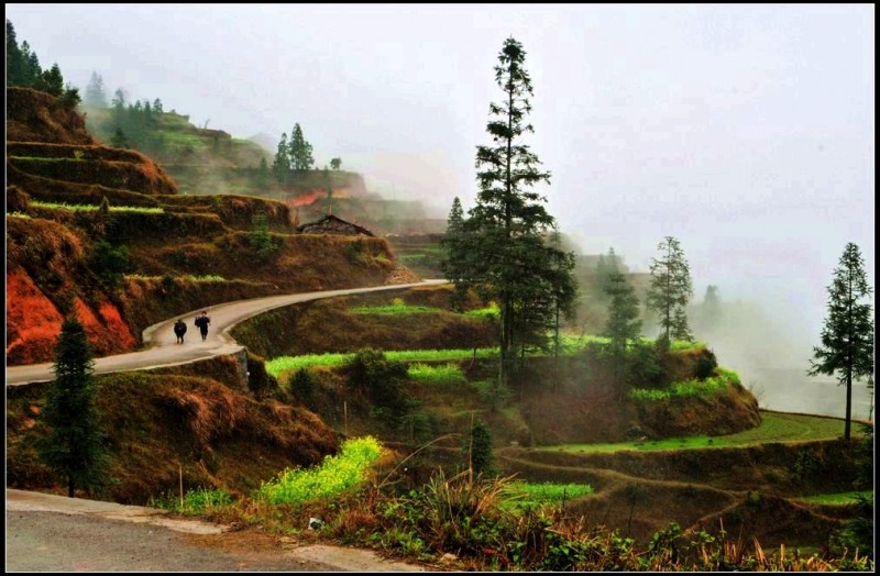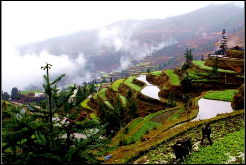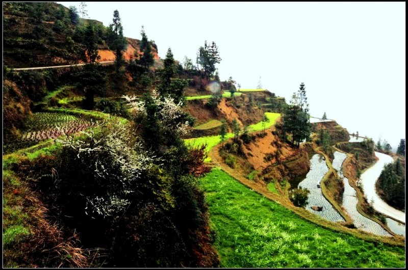 从肇兴到堂安的路上,漫山遍野,除了森林,到处是风景入胜的梯田。春季,盛满泉水的梯田像一面面镜子,在日光和雾气的映照下,白茫茫一片。那些点簇其中的油菜花,绿油油、金灿灿的,让人养眼。这“万顷梯田”令人流连忘返。