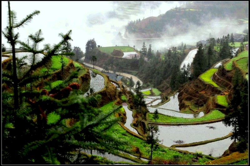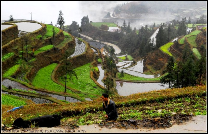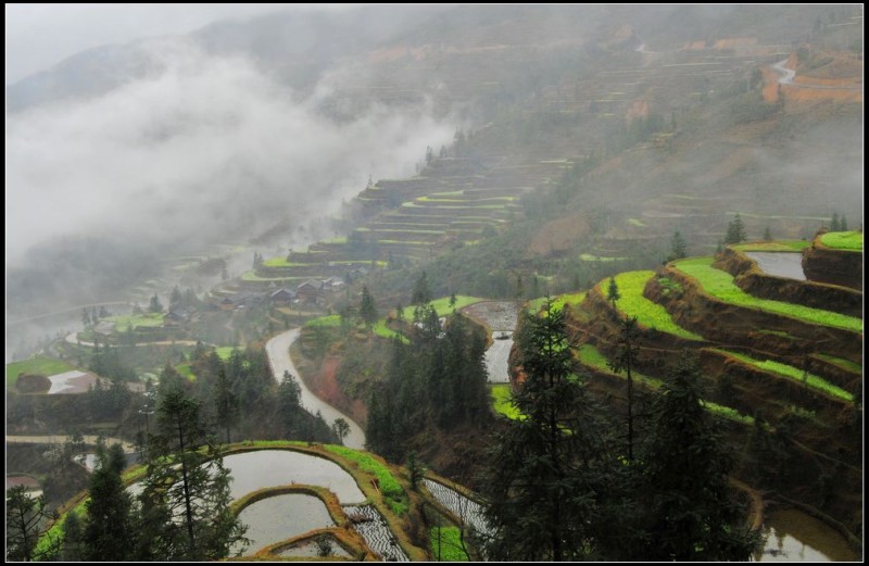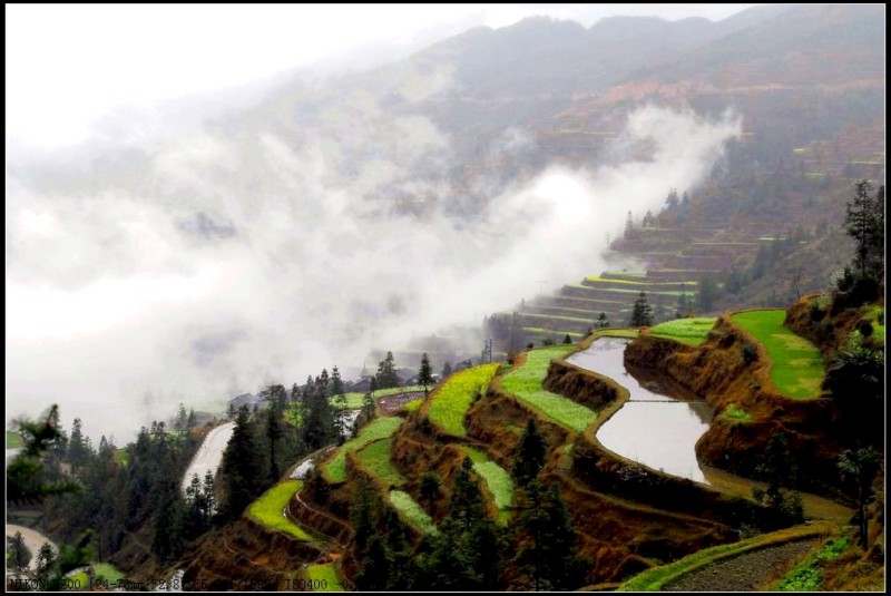 我们在堂安寨子逗留的半天时间里,整个村寨和遍野梯田,全都笼罩浓密的雨雾之中,能见度不足10米。当我们靠近万顷梯田时,突然一股气流冲散了眼前的浓雾,只见那一股股浓雾,顺着一条条谷沟往上爬升。瞬间,让堂安梯田明当当的显雾了真容。上帝仅仅给了我们俩15分钟时间,接着,浓雾又密密地罩住了所有的山头。