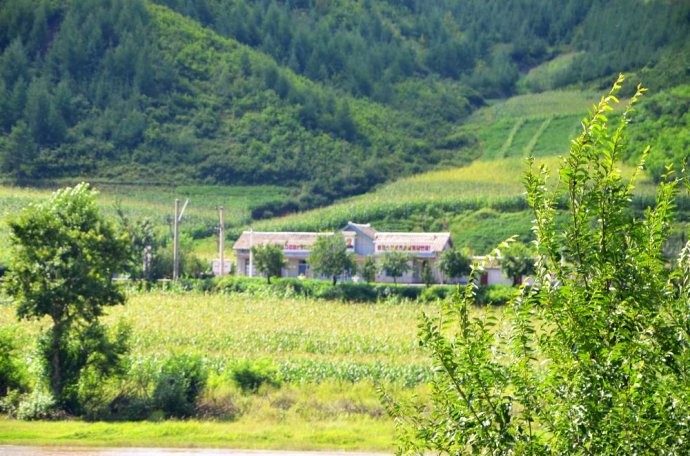 对面的平房有打字标语以及金日成的画像,山坡上有农民在耕作。