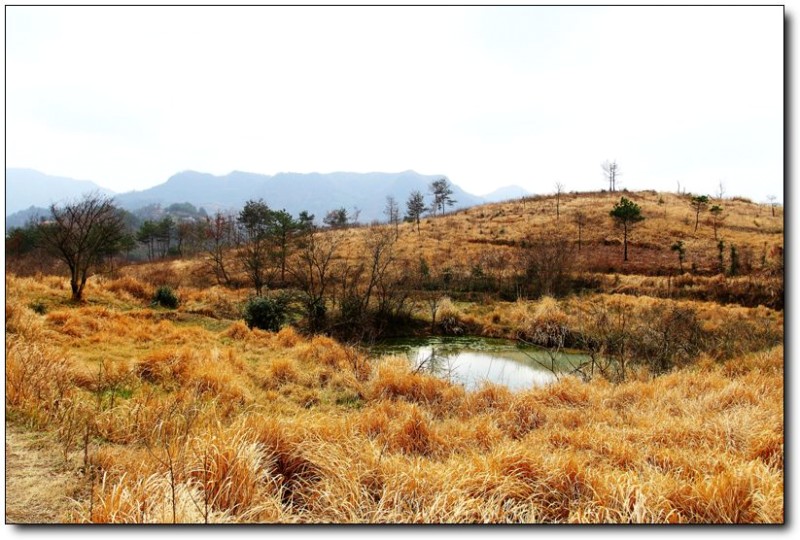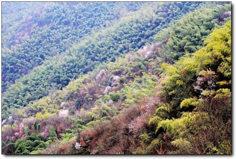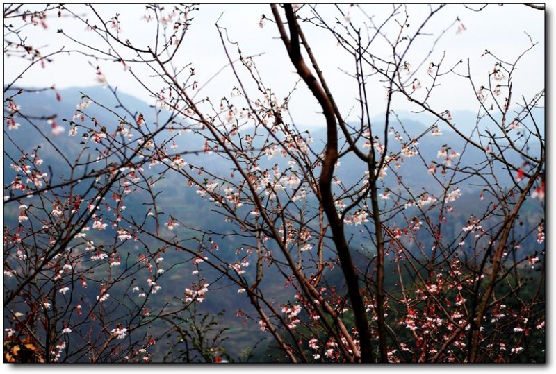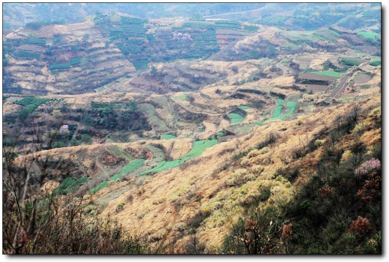 登顶后,你就可以看到这些风景,虽然春天的气息还有点欠缺、油菜地里也是绿绿的,但感觉还是不错,特别是点缀在山坡上的据当地村民所说的野樱花。