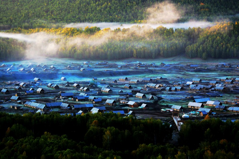 禾木自然、原始的山野风光,风景独美,禾木河自东北向西南流淌,原始落村与大草原和谐自然的融为一体。来到禾木村,首先进入我们视野的就是那一栋栋的小木屋和成群结队的牧群,与雪峰、森林、草地、蓝天白云构成了独特的自然与文化景观。其意义是这些小木屋已成为图瓦人的标志,小木屋基本有大半截埋在土里,以抵挡这里将近半年的大雪封山期的严寒,显得特别原始古朴,并带有游牧民族的传统特征。房顶一般用木板钉成人字型雨棚,房体用直径三四十公分的单层原木堆成,既保暖又防潮。
