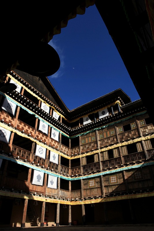 从丹巴至马尔康的沿途,先后去到了巴底土司官寨,安宁乡的乾隆御碑以及金川的梨花沟。巴底官寨年久失修已经接近荒废,周边的民居也嫌拥挤杂乱。乾隆御碑只是个小噱头,梨花沟的梨花也已经过了怒放的花期,所以在每个地点停留时间都不需要太长,以至于还能够在太阳落到大山后面之前赶到了曾经拍摄过电视剧《尘埃落定》的马尔康最大的土司官寨卓克基。从建筑艺术角度讲,如果把丹巴藏寨的民居藏楼看做是散落在沙滩上的珍宝,那么土司官寨就是其中最明亮耀眼的那颗明珠。无论从面积,布局,规模,材料以及装饰水平上都算得上藏式建筑的上乘自作。稍嫌遗憾的是太阳落山太快,天井和漏窗中的金黄的光影稍纵即逝,整栋塔楼和一街之隔的西索民居很快就笼罩在泛着蓝色的阴影之中,俯瞰民居,毫无规则的红蓝色金属瓦楞屋顶和密集摆布的太阳能热水器,让本就拥挤的建筑群更加杂乱不堪。如何在传统构造与现代装置之间寻找一种更美观的设计应用的平衡,这可能是中国所有古村落的自发性改良都正在或将要面临的问题和难题。