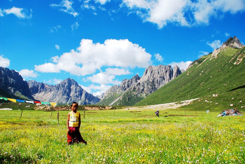 年保玉则是青海果洛草原的一座神山,主峰海拔5369米。年保玉则的神秘,莫过于变幻莫测的天气,七八月旬,也会领略到春夏秋冬四季之变迁。清晨满天星斗,却有大雪纷纷扬扬降下,寒气逼人,俨然隆冬景象,一轮红日从东方冉冉升起,整个山体被浓雾弥漫,不久金色的阳光洒满大地,碧空如洗。上午,山上浓去密布,下起倾盆大雨;正午时分,云开雾散,烈日炎炎,回到了盛夏的酷暑季节;午后,突然狂风四起,雷鸣电闪,冰雹从天而降;傍晚时分,夕阳西下,草原完全恢复了昔日的宁静,年保玉则揭开了神秘的面纱,婷婷玉立,婀娜多姿,她慈祥、和蔼的面容又展现在人们面前。神山年保玉则,以其重峦叠嶂,雪岭泛银,严冬打雷,盛夏飞雪,风吹石鸣,月明星灿而闻名。