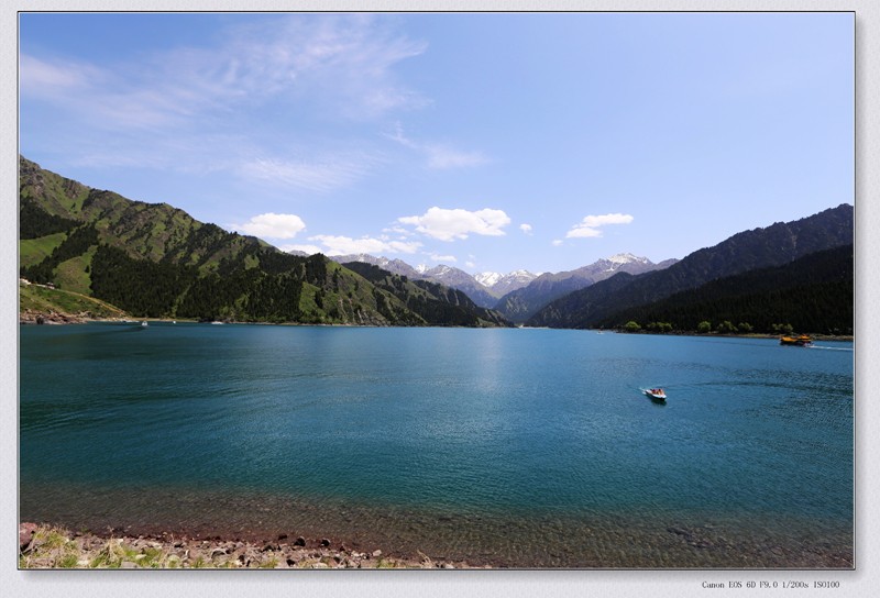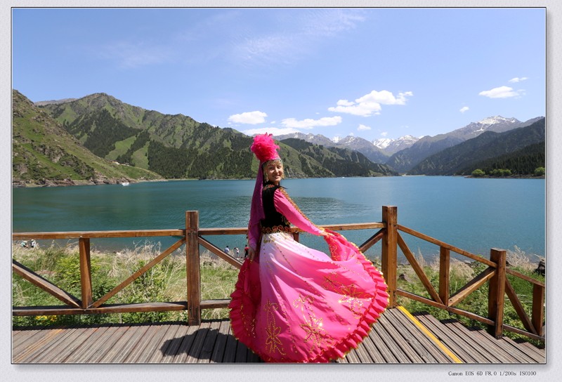 咋一看,这天池也不咋样嘛,跟我们村子旁边的小水库看起来也差不多,除了水库边的山头多了一点雪而已。真是让人失望。最郁闷的是,游客超级多,拍个照还得排队。于是在天池边上大约逛了个把小时,给老婆拍了几张照片,匆匆地赶回乌鲁木齐,准备早点去逛逛大巴扎。这100元的门票和70元的区间车花得可真不值啊。