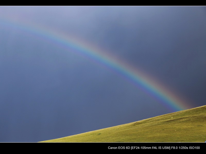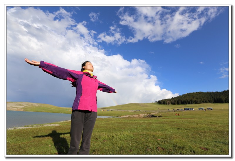 赛里木湖的天气变幻莫测,头顶下雨,远处却有太阳。雨后我们见到了久违的彩虹