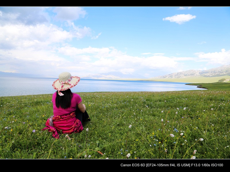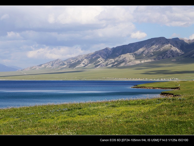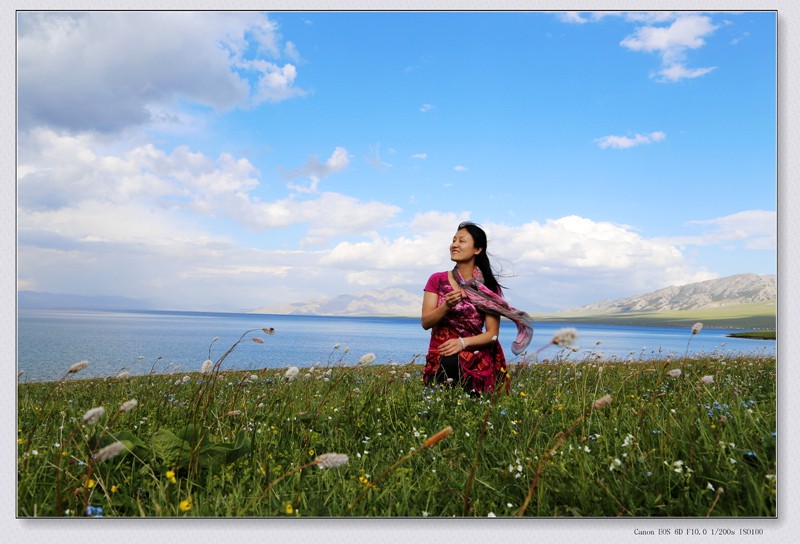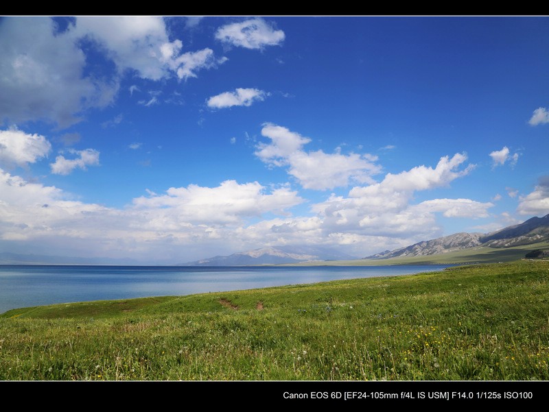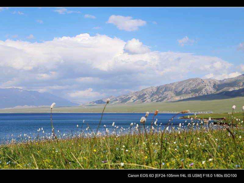 蓝天,白云,湖水,小野花,大自然最美丽的搭配