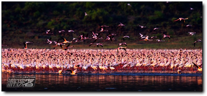 火烈鸟及其他鸟类摄影的绝佳之地。在这里您可以拍摄到数万只火烈鸟在碧水蓝天间飞翔的奇妙景象,粉红色的鸟群一望无际,壮美景象动人心魄,而且在这里还能看到珍稀的白犀牛。