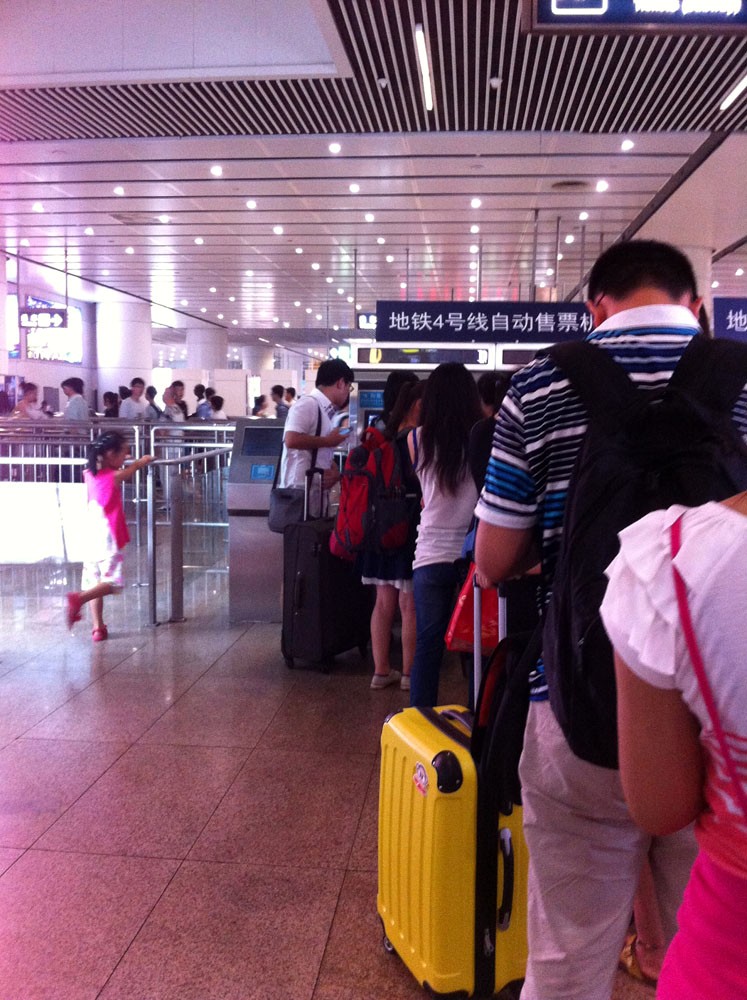 G110于下午2点14分准点到达!初次踏上帝都土地,俺还是很激动滴!俺们下高铁后就看到好多银、好多银!出站后开站进地铁通道,再安检,买票。额滴个娘,果然和小颖说的一样,买个票都排长长的长龙,行李交给小颖,挑条稍微短点的龙排上,听着前前后后京片子口音,我告诉自己:真的是到帝都了!
