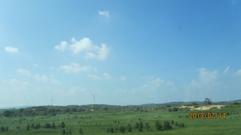 其实在到达围场之前,天空已经越来越蓝,道路两旁都是养眼的青山绿树,令人心旷神怡。进入御道口之后,景色更加斑斓起来,远处电力大风车吱呀吱地转。