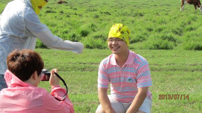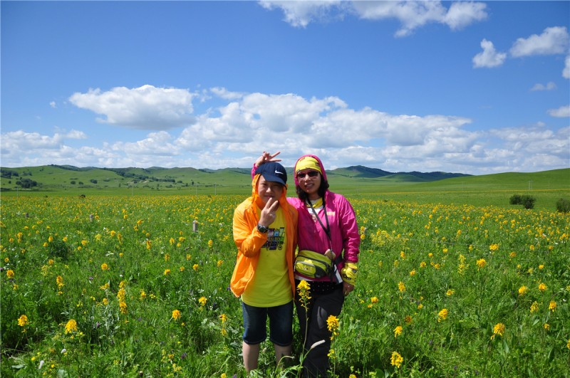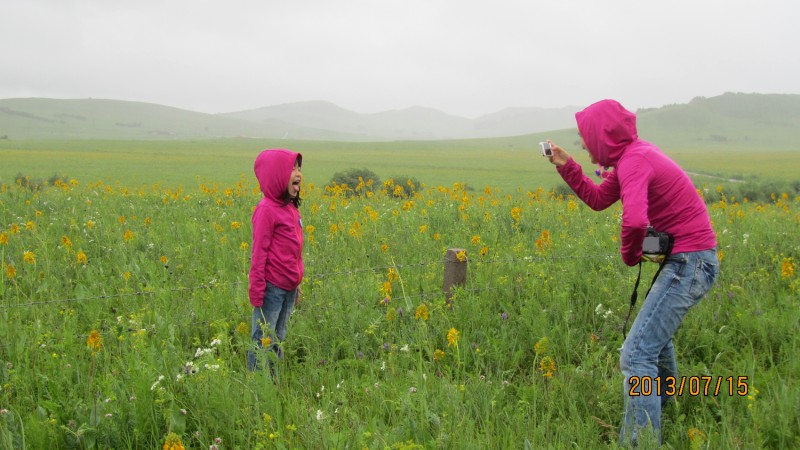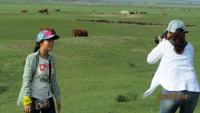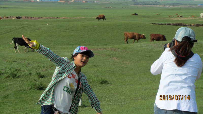 4点钟,张师傅猛地停下车,让大家下去拍照,噢吼,坐完几小时后终于可以舒张身子骨啦,每个人都显得非常兴奋,一下车那清爽、沁脾、柔软的空气扑面而来,我深深地大吸一口!!草原!!!!我们在一大片牛群前面嘻哈玩闹了半个小时,摆拍,足牛群,弹跳,也在这里拍下第一组集体照唷唷