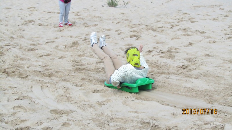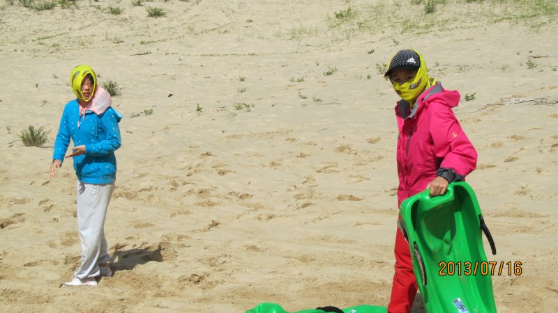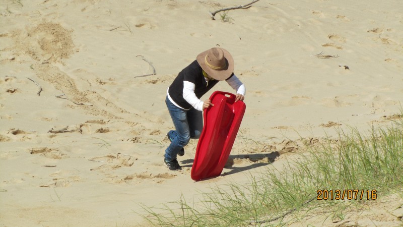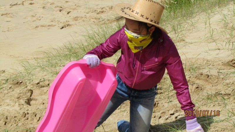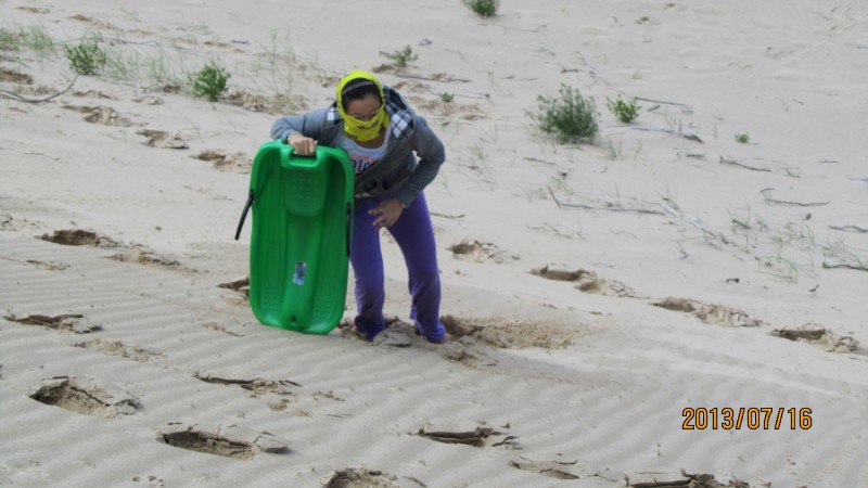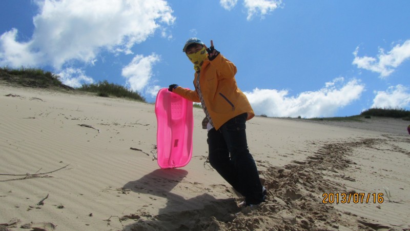 崔哥引领的沙场好巨型!!!穿鞋走在沙场,总觉得不尽兴,我迅速把鞋子袜子脱光光,并不停怂恿其它人向我学习吼吼吼。由于前一天刚下过雨,整片滑沙场除了杂乱的树枝横七塑八潜伏在沙中,还是尽显异常平滑而且有弧线。未开滑便觉得肯定很爽····