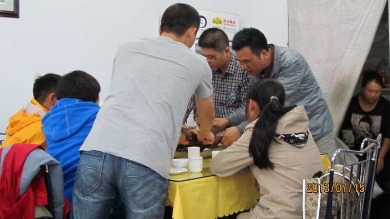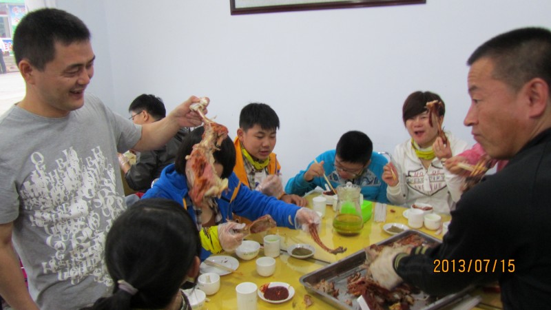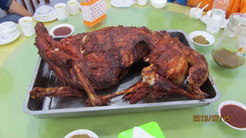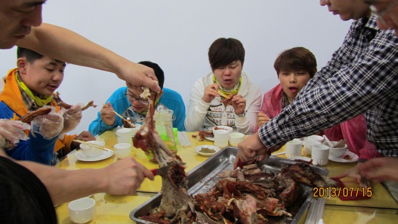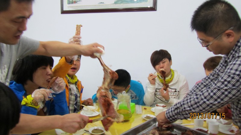 我们的队员分别坐了三桌,为烤全羊,烤半羊,烤半羊,最后,三桌都赏赐了可怜巴巴的张师傅、美丽和我(未预定位置的队员突然加入,坐不下啦,我们仨只好临时退出)这样一来,我们的桌上也多了好几份烤羊肉·····