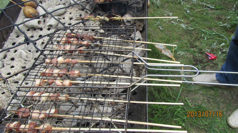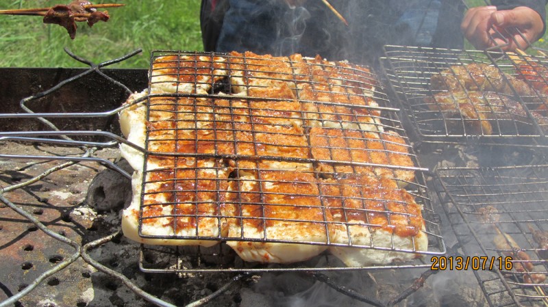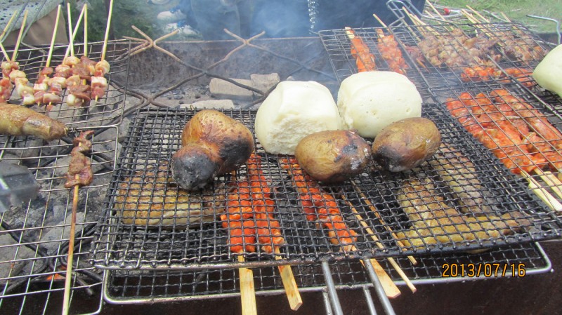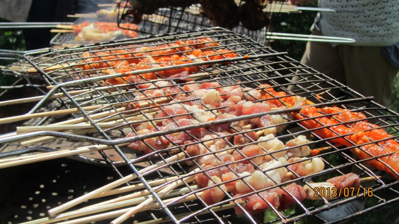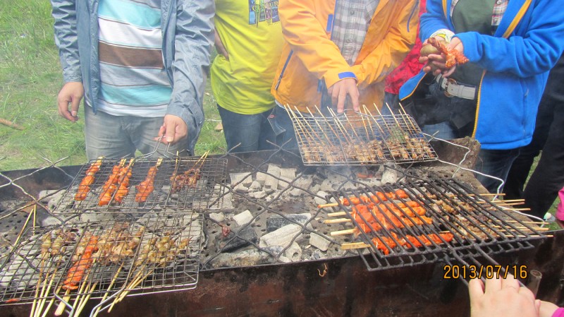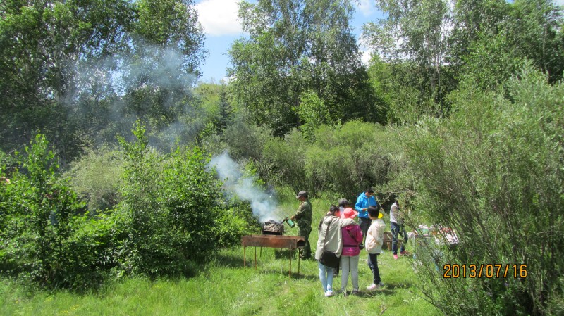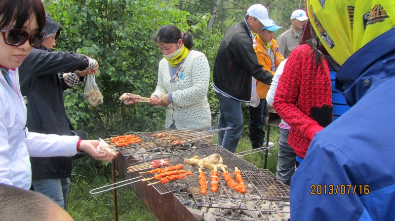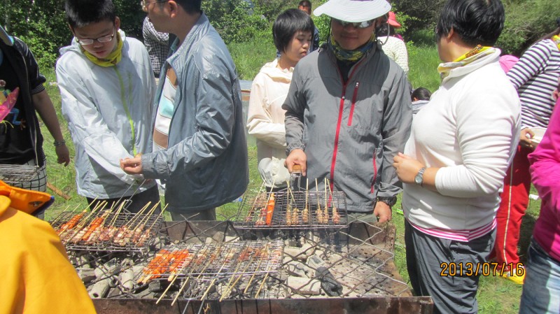 去到烧烤场地,真佩服崔哥崔嫂的安排啊!把所有烧烤的器具全部搬来:饮用水、烧烤调料、烤架、炭等等。中饭可烤的食物包括(馒头、骨肉相连、羊肉串、土豆、鸡脖),按车号领食物和饮用水。火腿肠、啤酒需要另花钱买。