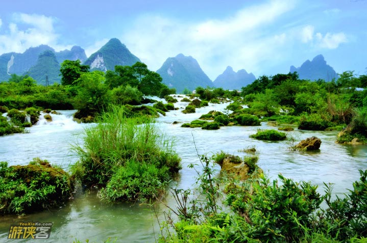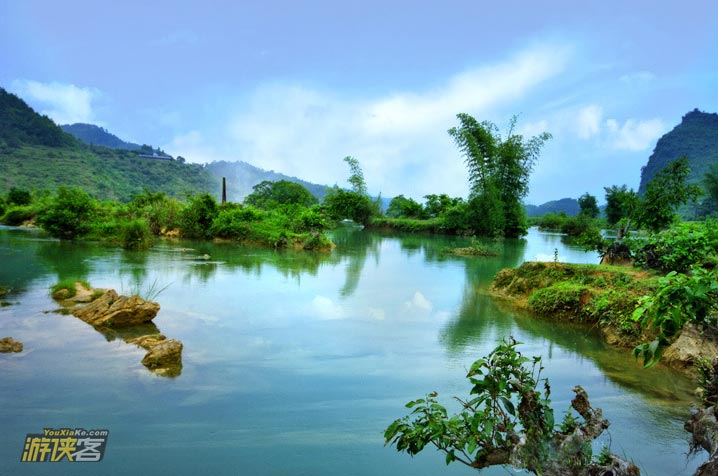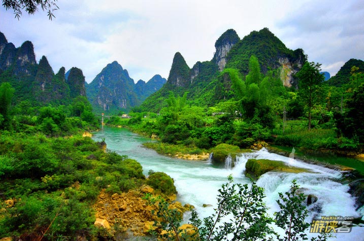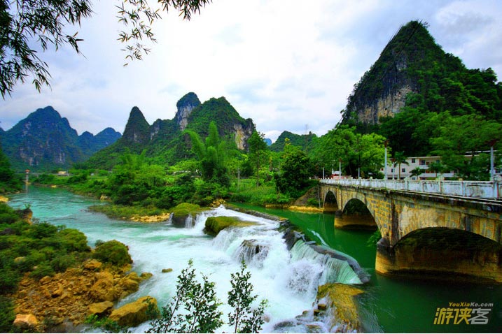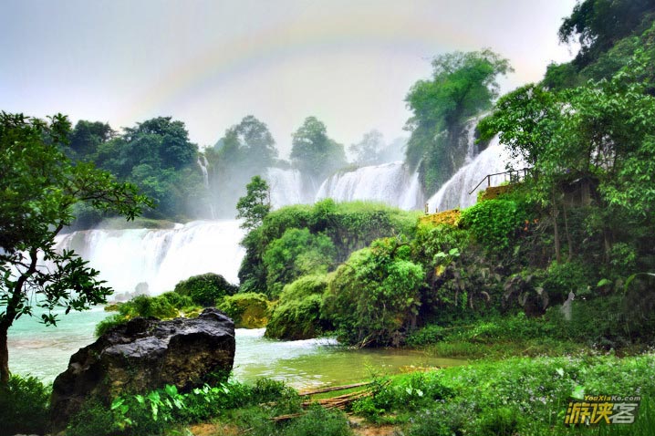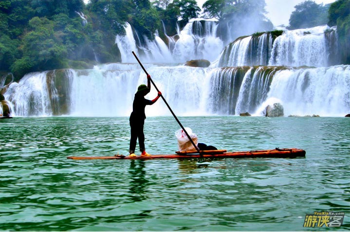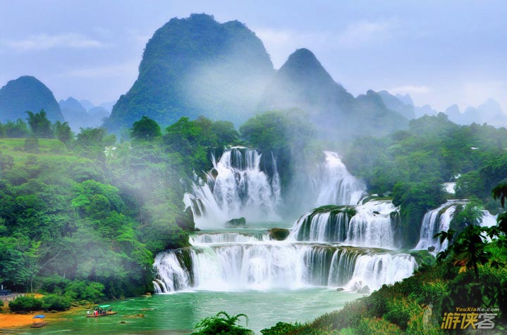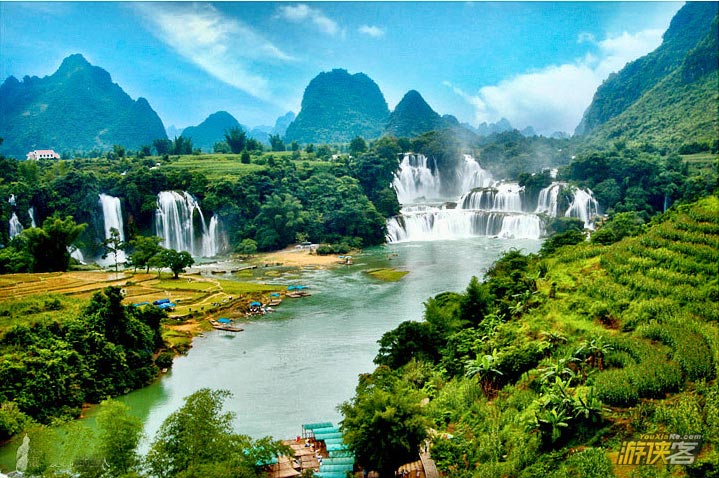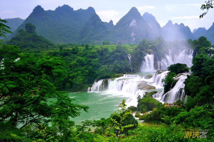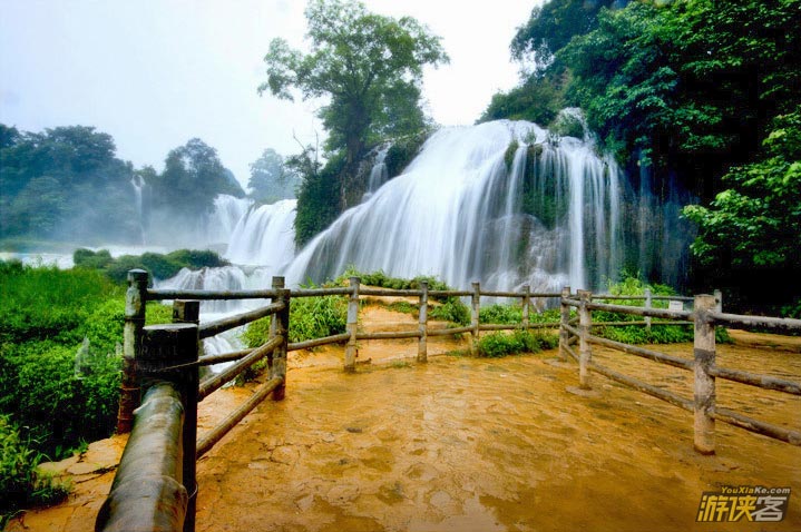 德天瀑布位于广西南宁地区边陲大新县,在中越边境交界处,归春河上游,瀑布气势磅礴、银瀑飞泻、三级跌落,蔚为壮观。若与紧邻的越南板约瀑布相连,排在巴西-阿根廷之间的伊瓜苏大瀑布、赞比亚-津巴布韦之间的维多利亚瀑布以及美国-加拿大的尼亚加拉瀑布之后,是世界第四大、亚洲第一大跨国瀑布。