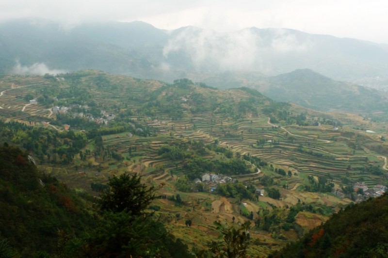 4、从济公殿往临海的黄坦方向走,能看到大景梯田,当然配合大景的天气非常重要,雨后的彩虹应该是绝色了吧。此行有云雾,因为阴天少了蓝天,对出片是不利的,但是,我们嗅到大山里那种清新和湿润也只能身临其境才能体会的了!