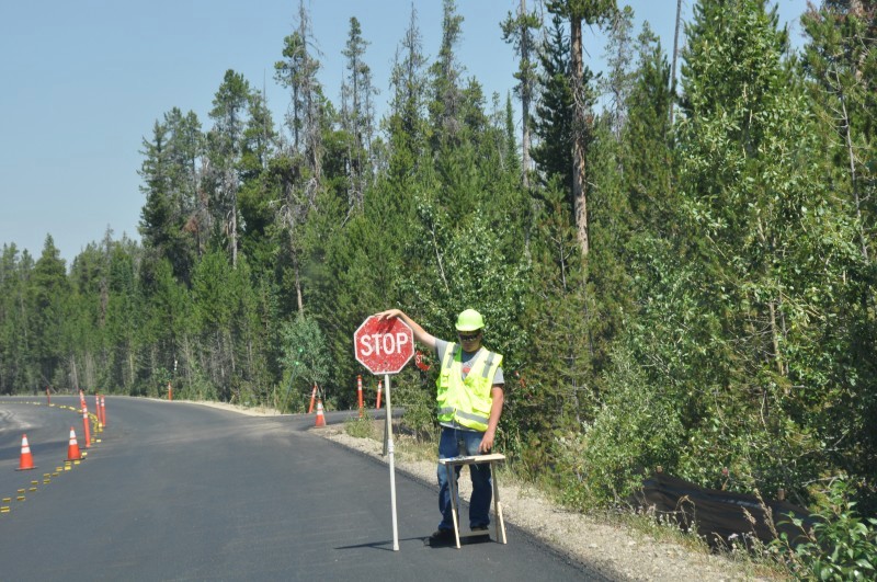 路上经常会遇到这样在修路的,一般是路不堵死,两头各站一人,拿着个STOP-SLOW的牌子,STOP大家就停车等着对方过来,SLOW就往前走,基本就堵10几分钟
