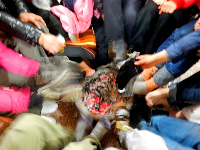 一盆烧得旺旺的炭火给我们带来温暖,为我们烤干被冰雪打湿的鞋袜。