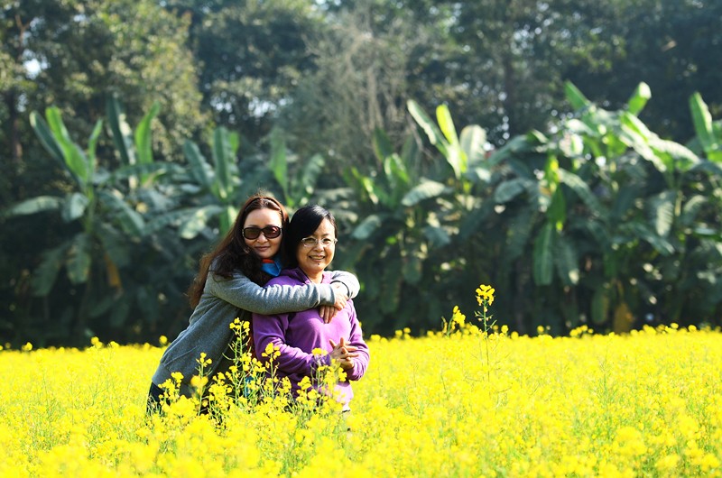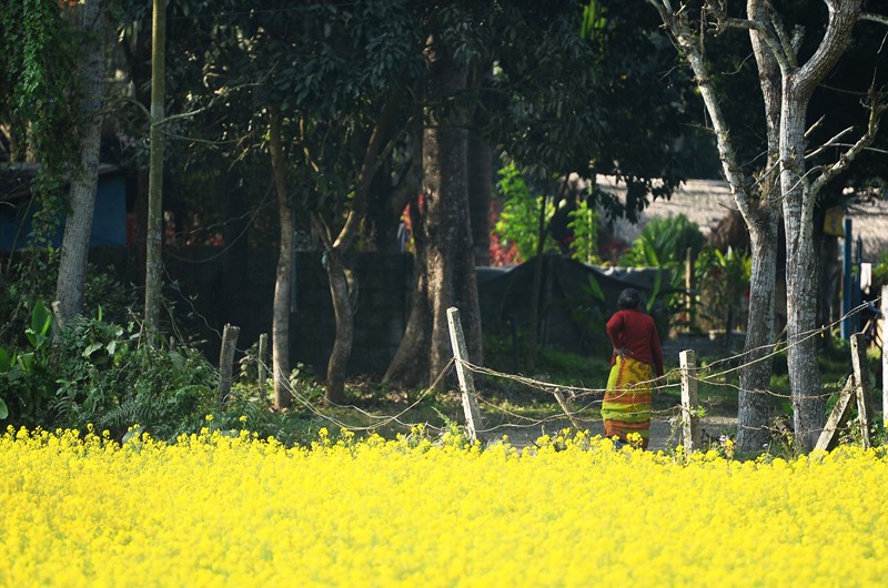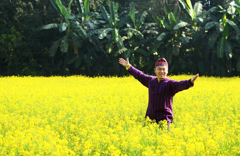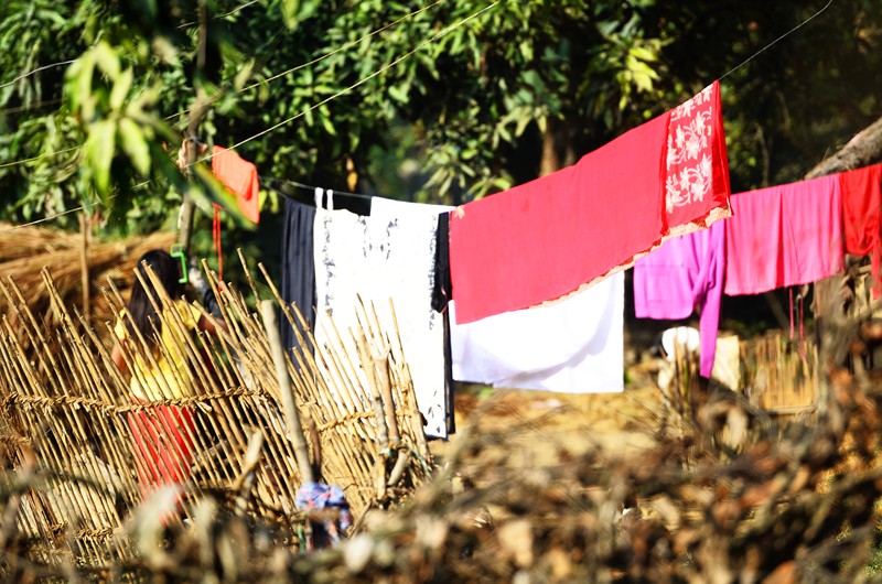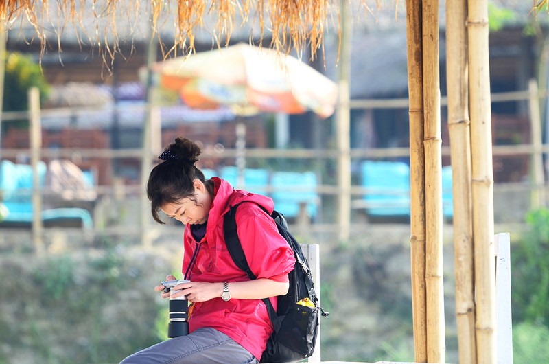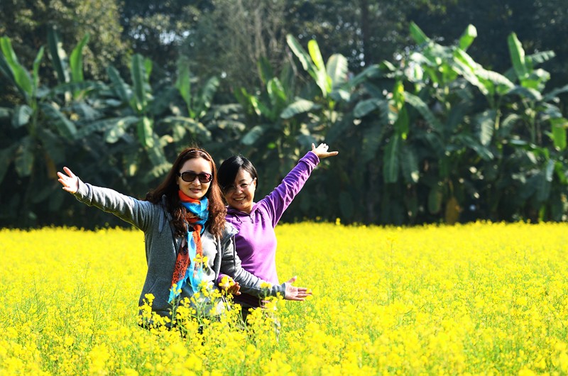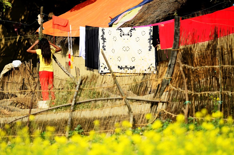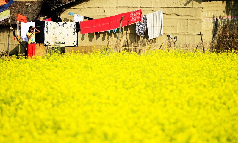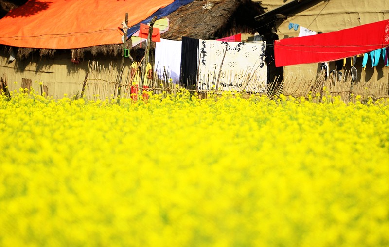 塔鲁人村落的油菜花已经开的非常的灿烂,当地小妹在花丛后梳妆,真是人比花俏。