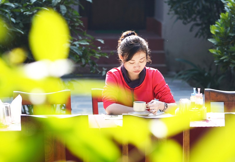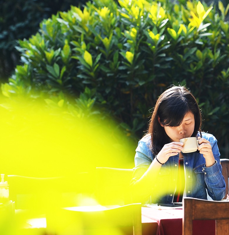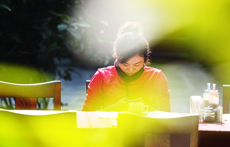 餐后大家沐浴在阳光中,悠闲的喝茶、上网