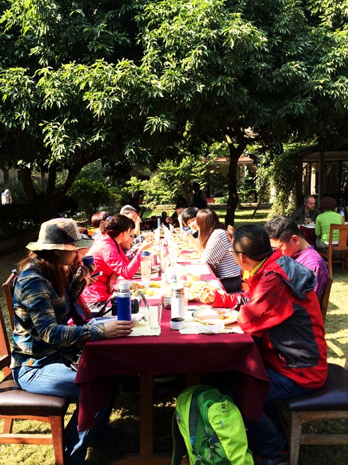 餐后大家沐浴在阳光中,悠闲的喝茶、聊天