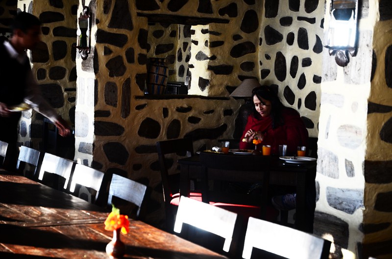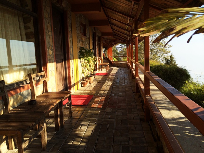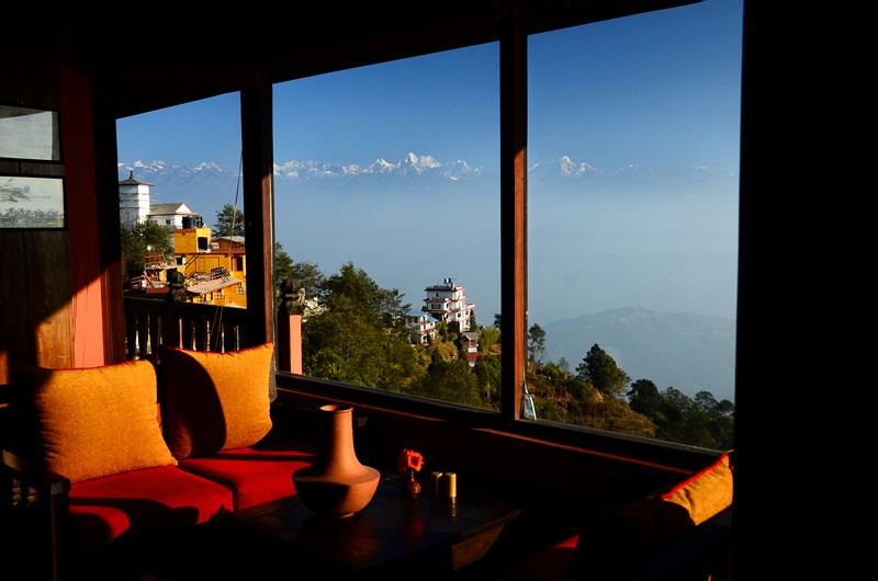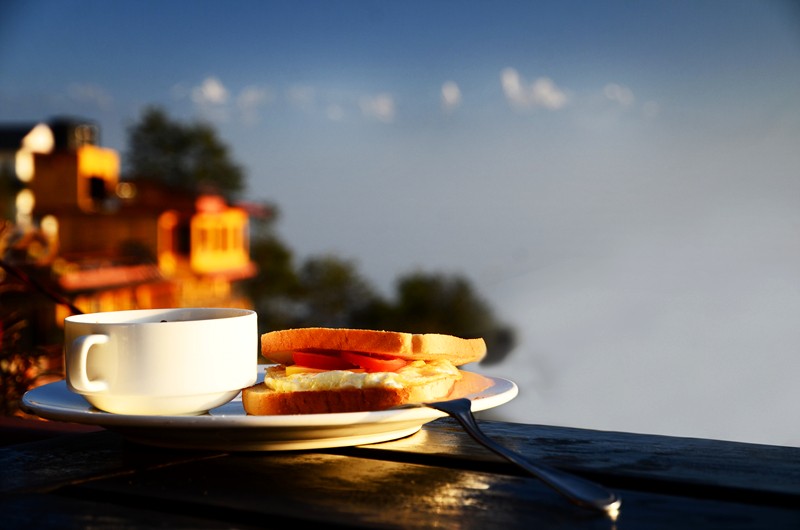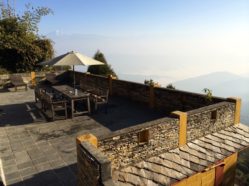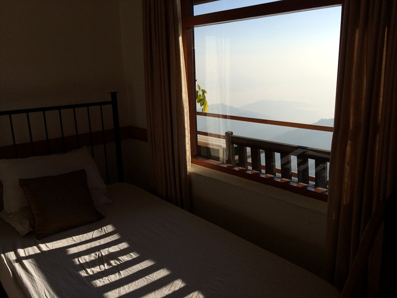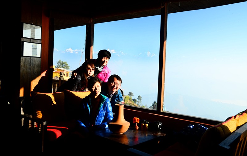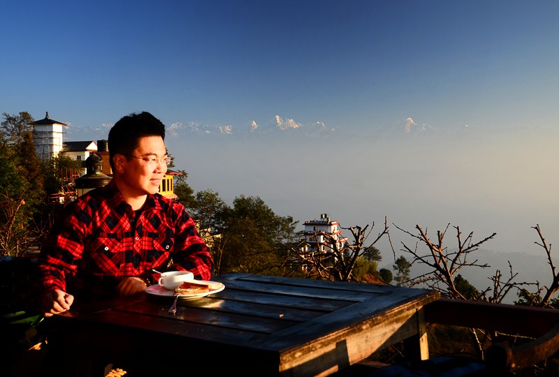 坐在酒店走廊上,喝着橙子,吃着早餐,喜马拉雅就在眼前