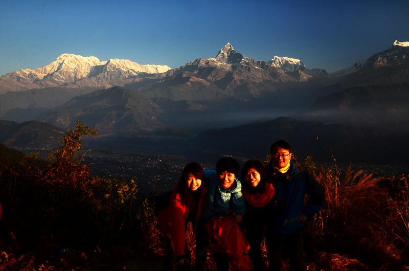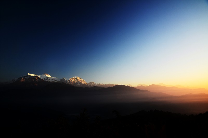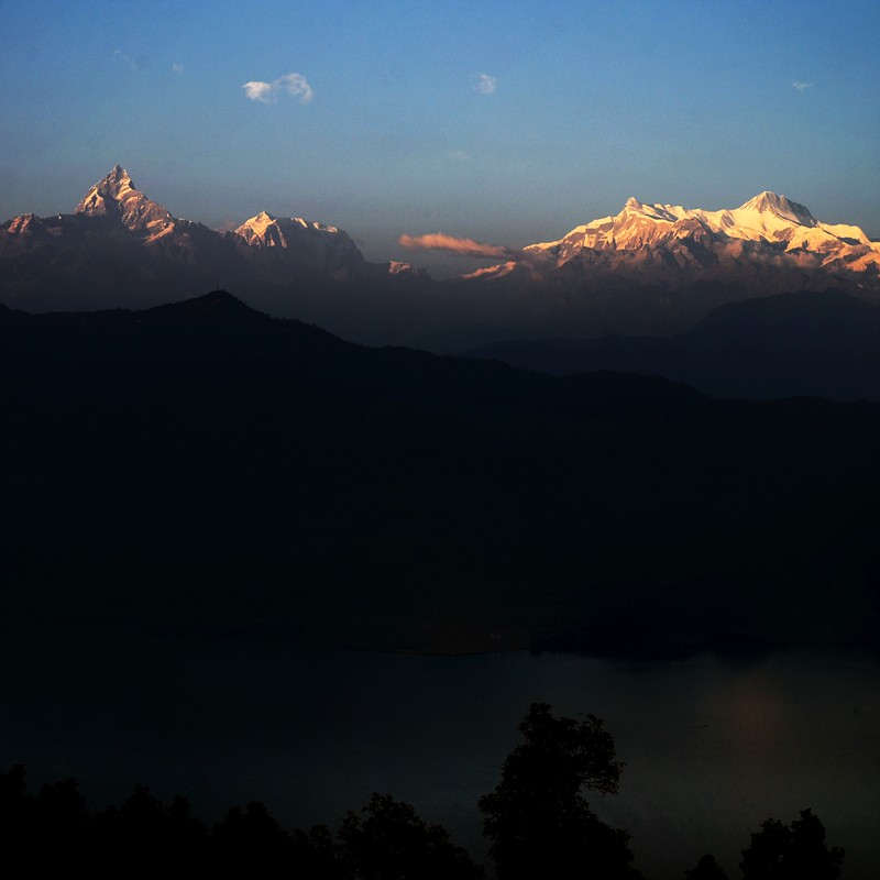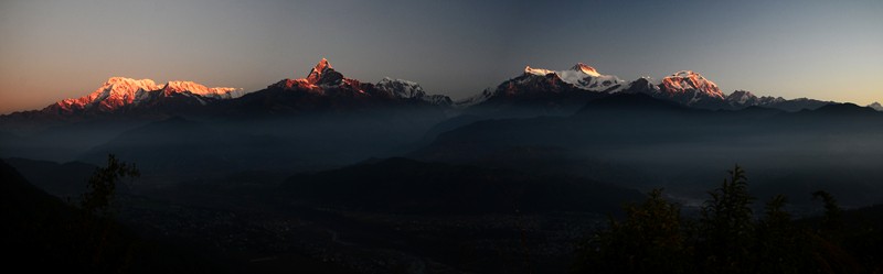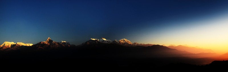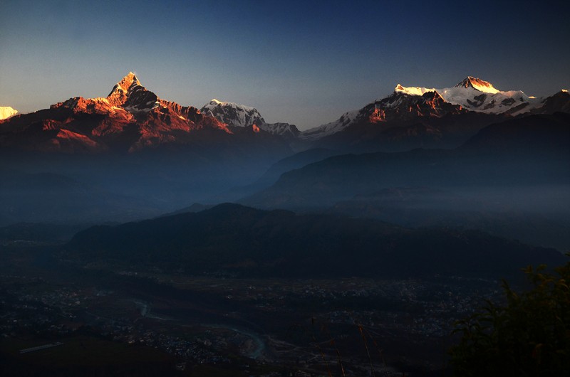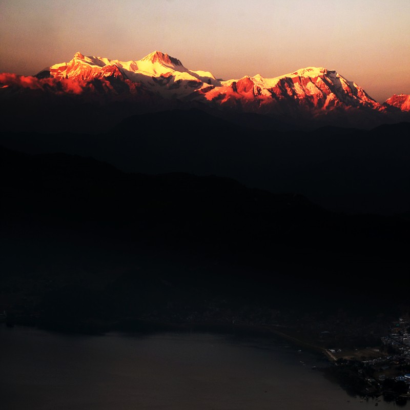 清晨,站在海拔1592米萨朗阔特观景台,从萨朗阔特北望,安纳普尔纳群峰一溜排开,西边的道拉吉里(Dhaulagiri)(8167m)。中间的鱼尾峰(6697米)虽不是群峰中最高的,却是尼泊尔的圣山,声名远播。安纳普尔纳二峰(7937米)位于最东边。安纳普尔纳的其它几个山峰海拔都在7500米以上。此地以拥有绝美的视野著称,天边呈现一条玫瑰色的天际线,越来越红,太阳跳出天际线,瞬间鱼尾峰及诸峰被罩上一层金色的霓裳,美轮美奂,博卡拉小镇开始苏醒,房舍林立的博卡拉市区就映入眼帘。