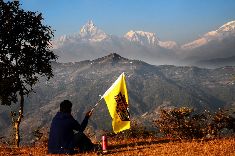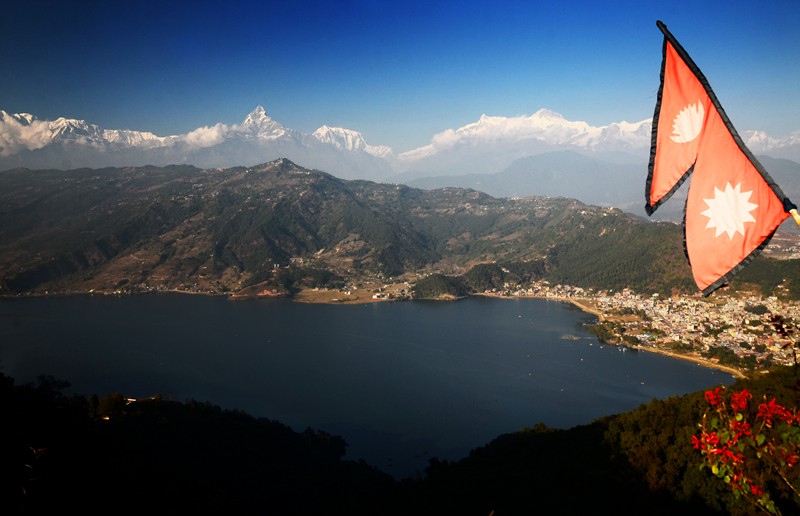 徒步登山世界和平塔,费瓦湖就在脚下(右侧为尼泊尔国旗)