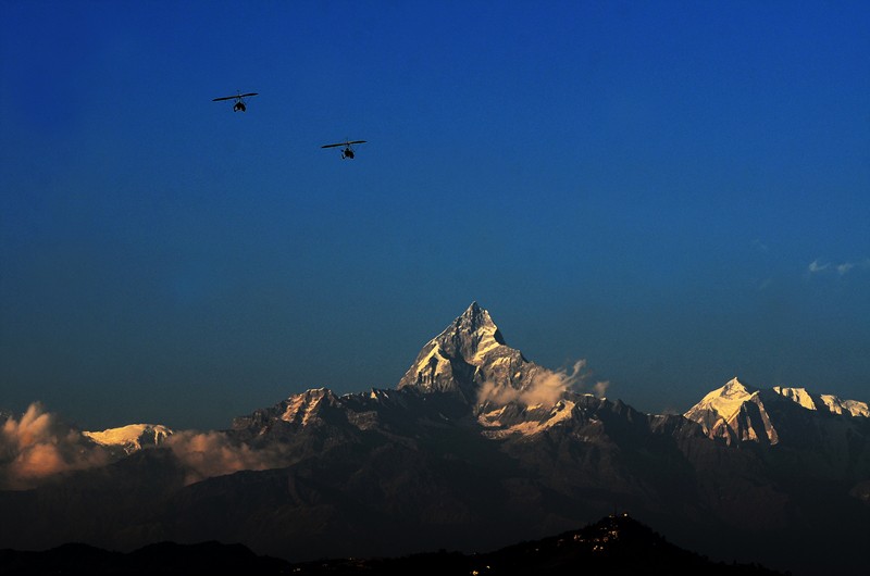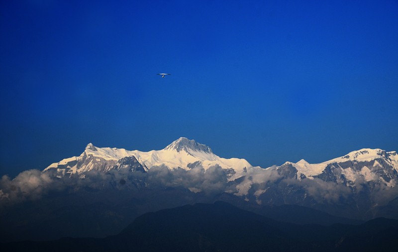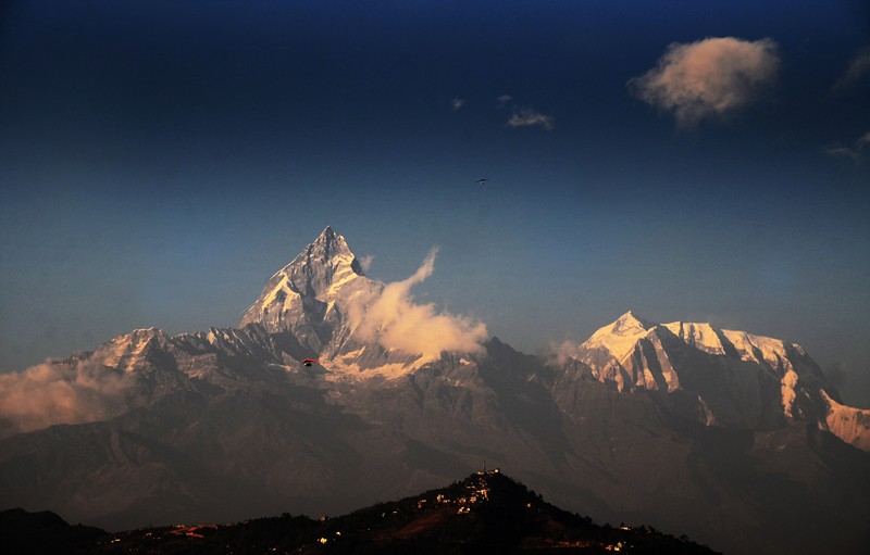 世界和平塔观安娜普纳雪峰,滑翔机在山顶滑翔